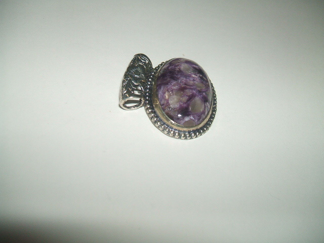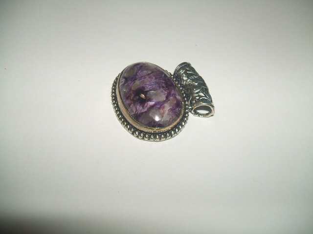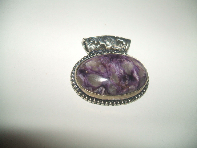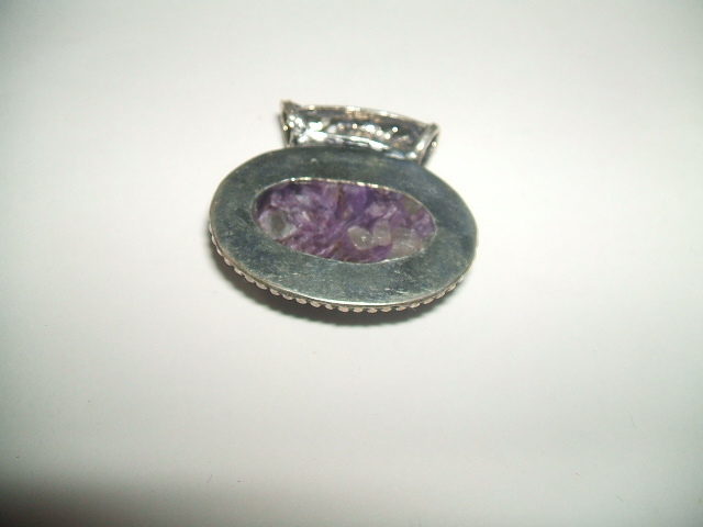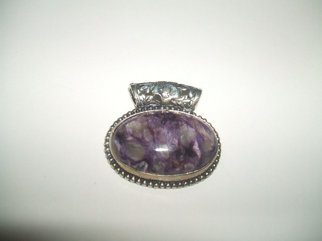濃いパープルと半透明の白が混じりあった美しい模様のチャロアイトトップです。石の大きさは約1.7x2.7センチ。横長のアンティーク風デザインのバチカンは内径が約4ミリ。金属はシルバーですが、925の刻印が見つかりませんので、あらかじめご了承ください。