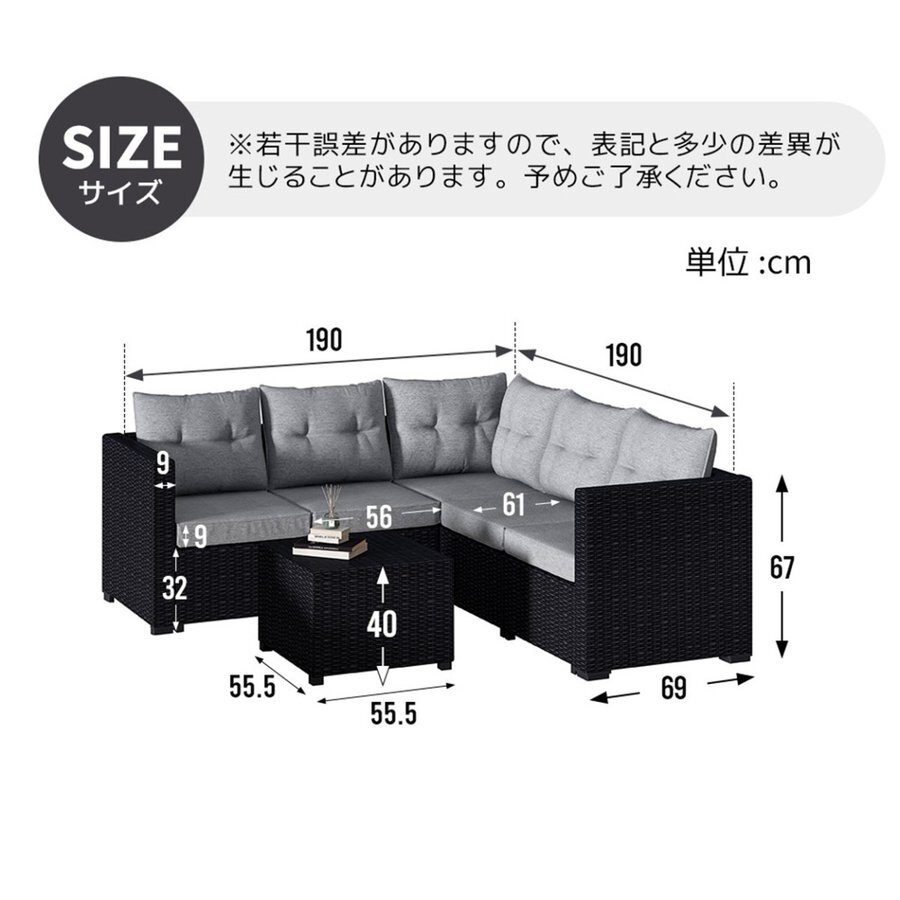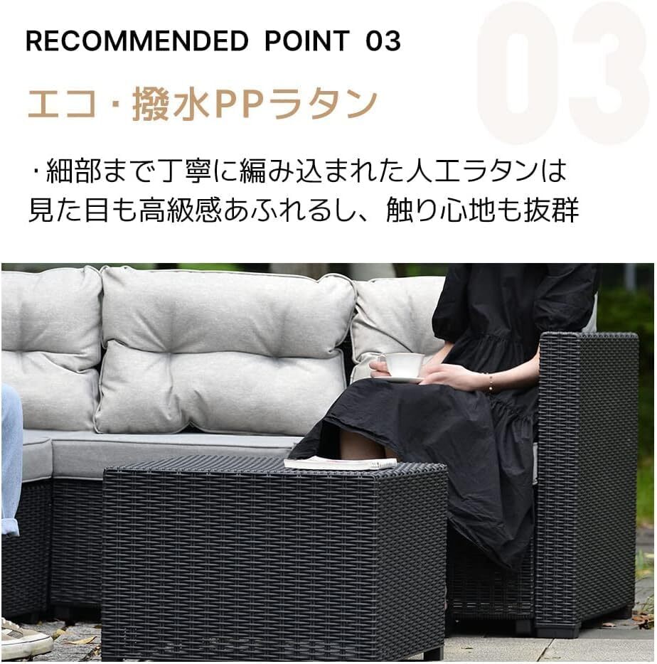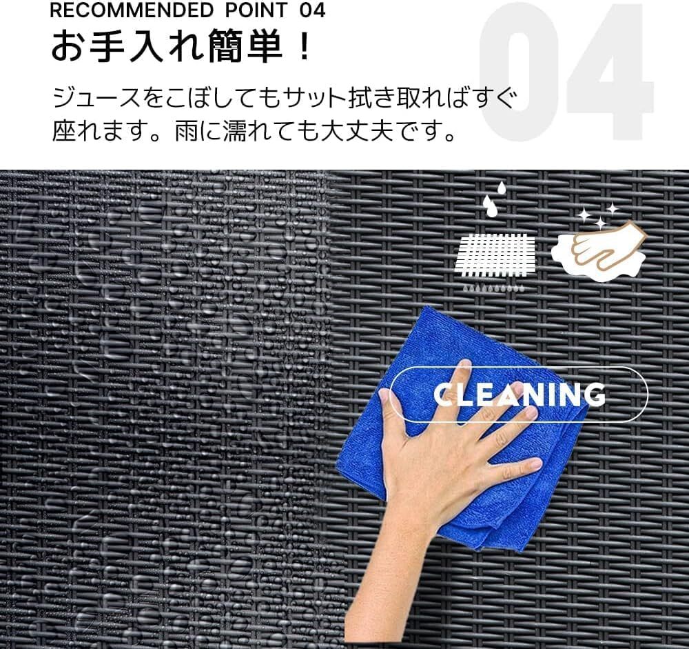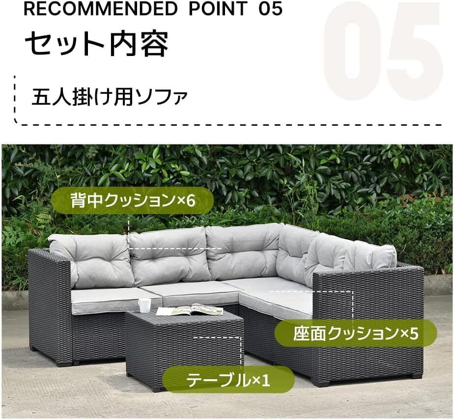この商品について: ◎01リゾート風に演出 ◎02楽組み、ネジも工具も不要 ◎03エコ・撥水PEラタン ◎04軽くて丈夫 ◎05お手入れ簡単 ◎06 五人掛け内容 ◎07フワフワクッション付き 商品の説明: ◆ 01 樹脂製 ガーデンファニチャー お庭やウッドデッキで贅沢な時間が楽しめる ラタン家具のような美しいデザインは、お庭をリゾート風に演出してくれます。 ◆ 02機能と特徴----大解剖 弊社 はめ合わせるだけ、ネジも工具も不要 女性でも一時間ぐらい組立完成 軽くて丈夫 他社 ネジ穴がたまにみ合っていないため組み上げが困難 ネジを締めることが難しく、組立時間は約6倍 重くて運びにくい ◆ 03楽組み、ネジも工具も不要 力いらず簡単に組み立てられる革新的な組立方式 面倒なネジ止めが全くないので、もっと便利! ジョイント式で各部品を連結するだけ、耐久性に優れた構造で外観の美しさや長い寿命を実現します。 1. ジョイント用円型フックを本体のジョイント穴に差し込みます。 2. 押しながらロックします。 ◆ 04エコ・撥水PEラタン 細部まで丁寧に編み込まれた人工ラタンは見た目も高級感あふれるし、樹脂製ですが質感はラタンを編み込んだようなリアル感があります。 ◆ 05軽くて丈夫 サイズは大きいですが、同じサイズのアウトドア家具より軽くて、移動はラクラク。 ◆ 06お手入れ簡単 ジュースをこぼしてもサット拭き取ればすぐ座れます。 水濡れに強い樹脂製ソファー&テーブルなので、汚れた際は水洗いできメンテナンスが楽です。 ◆ 07五人掛け内容 五人掛け用ソファー1脚(クッション付き) ガーデンテーブル1台 ◆ 08フワフワクッション付き 注意 クッションが濡れたら、干したあとご使用ください。 防水効果はないため、雨の日は屋内に入れておくことをお勧めします。
