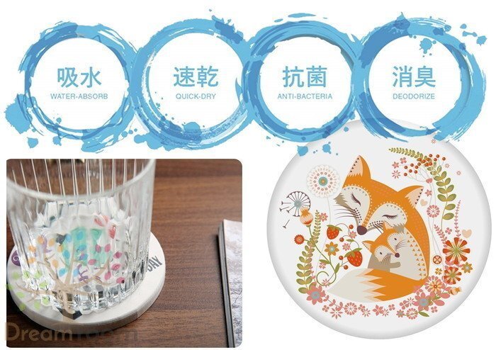 056-01 吸水力抜群 速乾性 珪藻土 かわいい コースター 丸 キツネ フォックス 速乾 水滴を素早く吸収☆