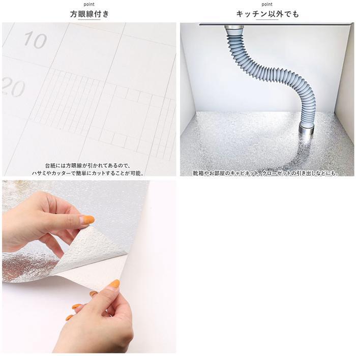 商品説明 | ・・様々な場所で活躍する保護シートが登場。 ・【耐熱仕様】 ・耐熱性のあるアルミ素材でコンロまわりなど、火気が心配な場所でも安心して使用可能。 ・【汚れや傷から保護】 ・柔らかくやや厚みのある質感なので、食器や棚の汚れ・傷付き、調味料などをこぼした際の流れ込みも防止! ・【お手入れラクラク】 ・汚れたら、サッと水拭きするだけでOK。 ・【方眼線付き】 ・台紙には方眼線が引かれてあるので、ハサミやカッターで簡単にカットすることが可能。 ・【キッチン以外でも】 ・靴箱やお部屋のキャビネット、クローゼットの引き出しなどにも。 |