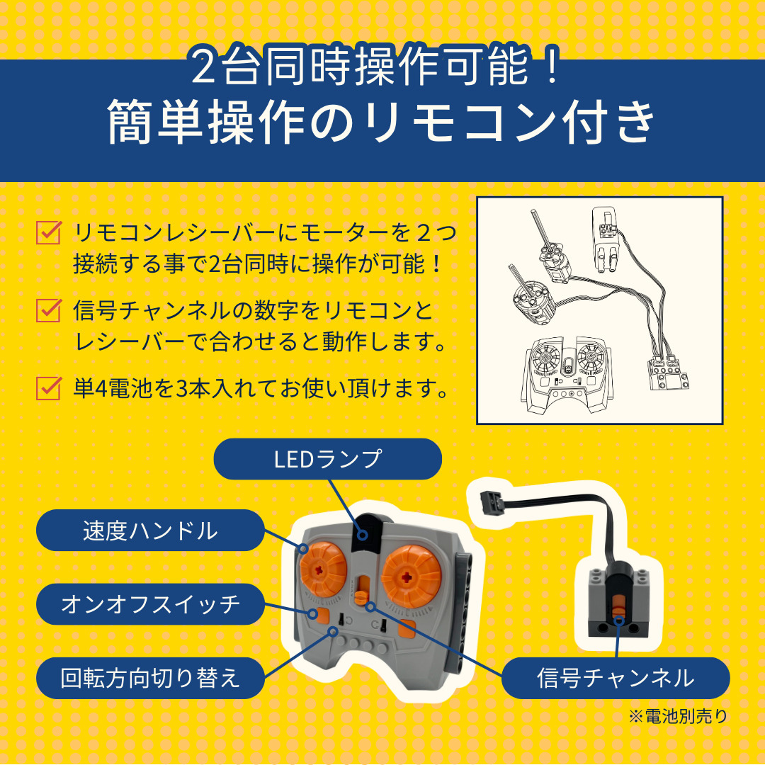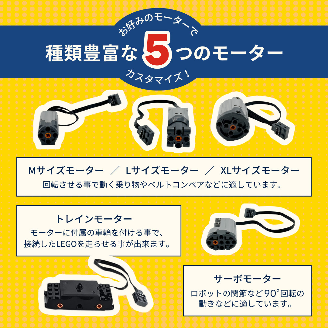 日本発のロボティクス技術から生まれた41個セットです。2モーター同時制御システムと精密サーボモーターで電車、自動車、ロボットなど様々な動くモデルを制作できます。