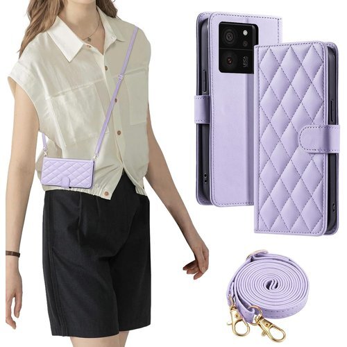 laddutoi FOR xiaomi 13t ケース xiaomi 13t pro ケース 手帳型 おしゃれ ストラップ付き スタンド機能 カード収納 軽量 薄型 耐衝撃 高級PUレザー 滑り防止 財布型 内蔵マグネット 開閉式 チェック柄 上質 耐摩擦 マグネット式 肩掛け 斜め掛けーパープル 2719