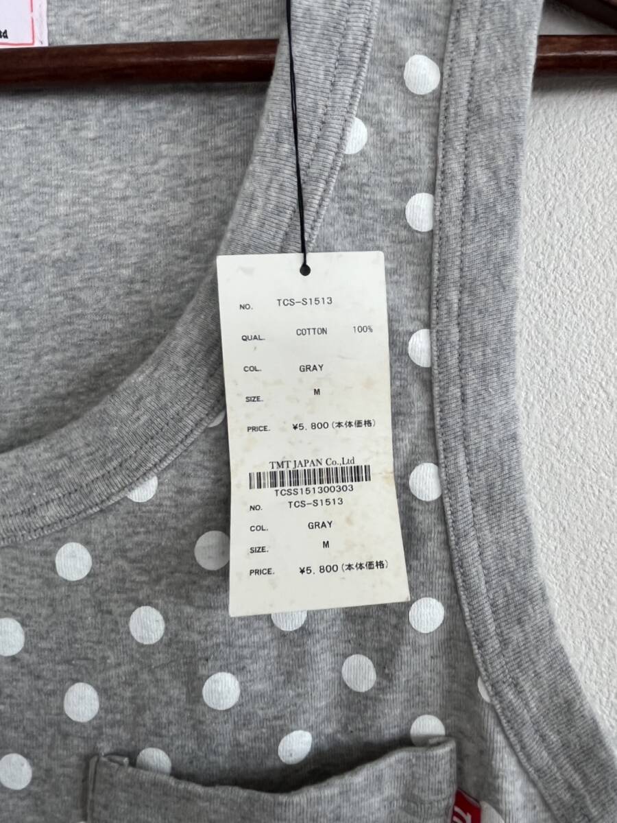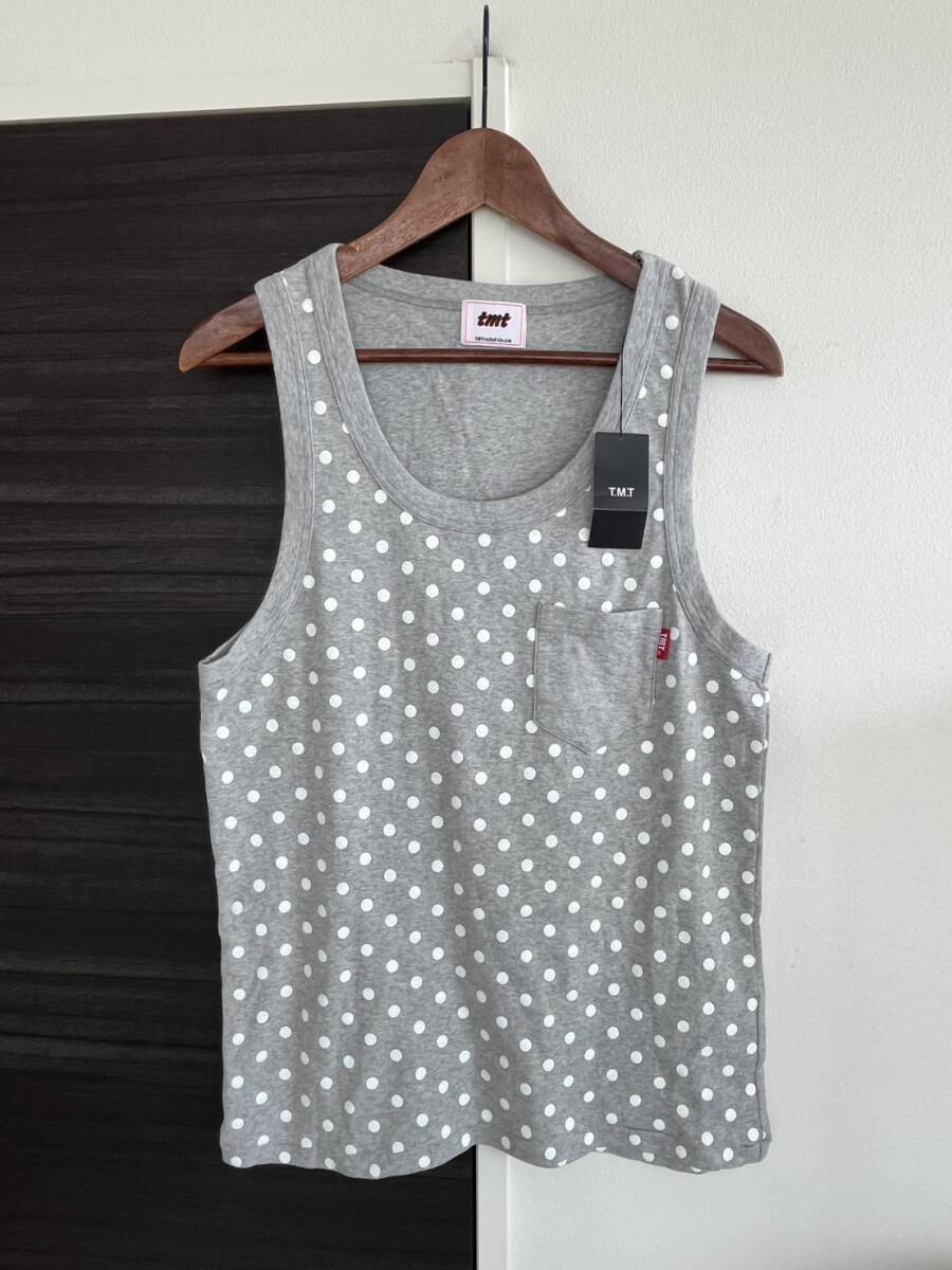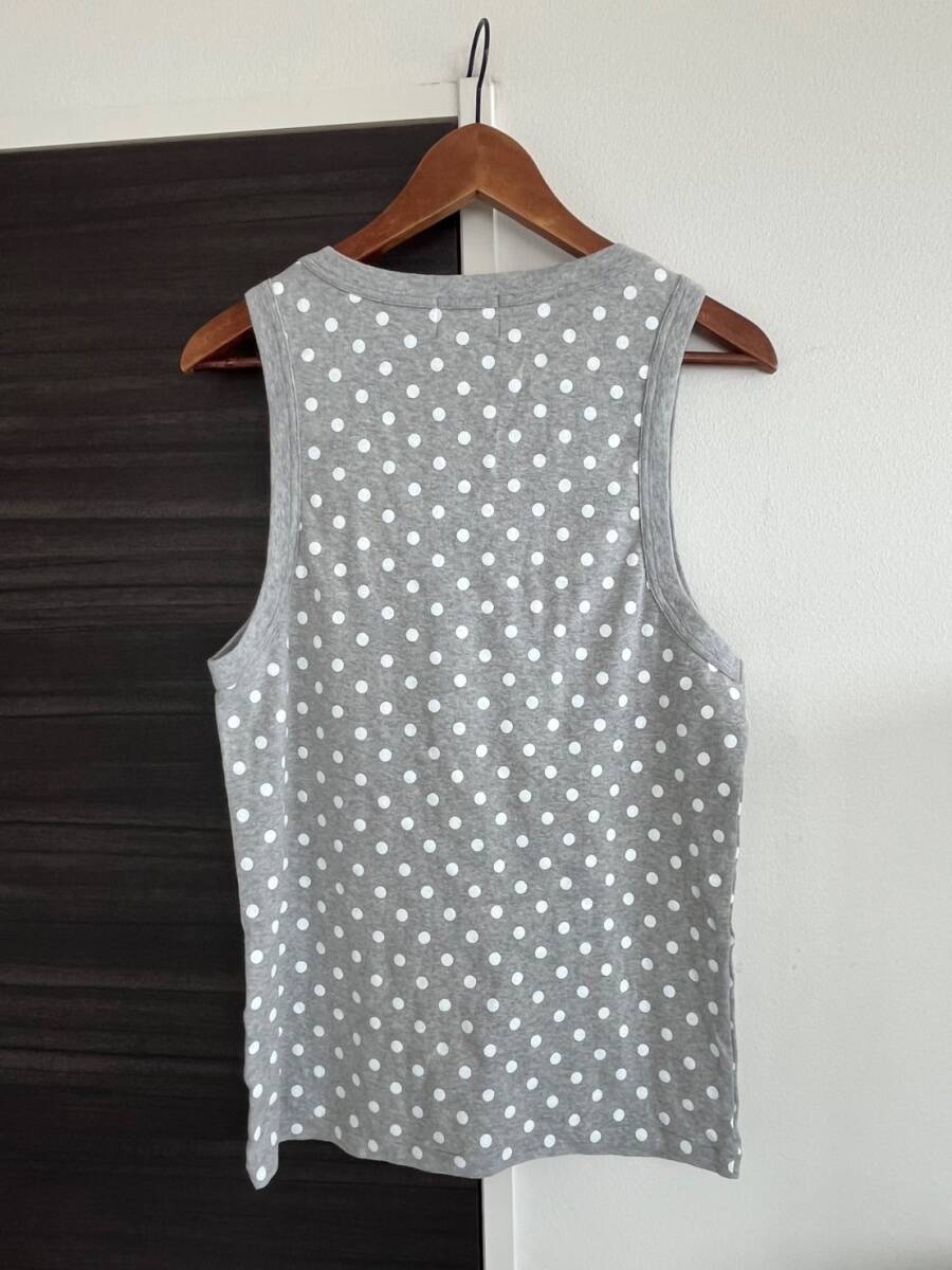 グレーのドット柄タンクトップ、コットン100%で快適な着心地。