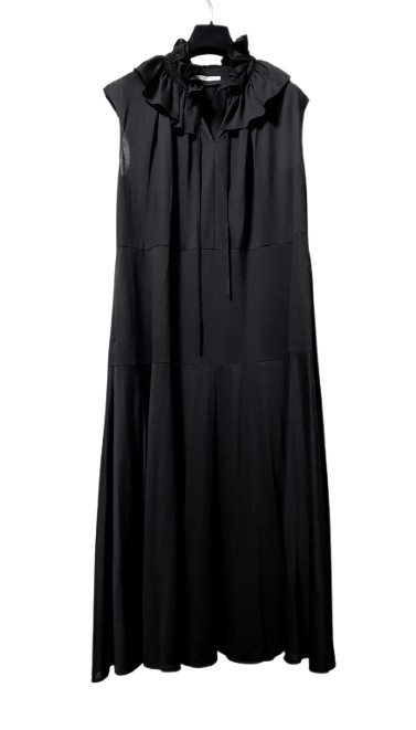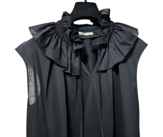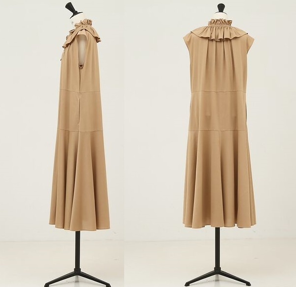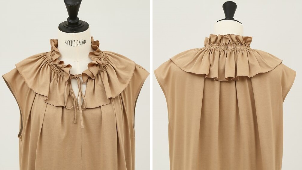 襟元のラッフルをポイントに、裾にかけてはフレアーシルエットになっているので甘くなり過ぎず着こなせます。