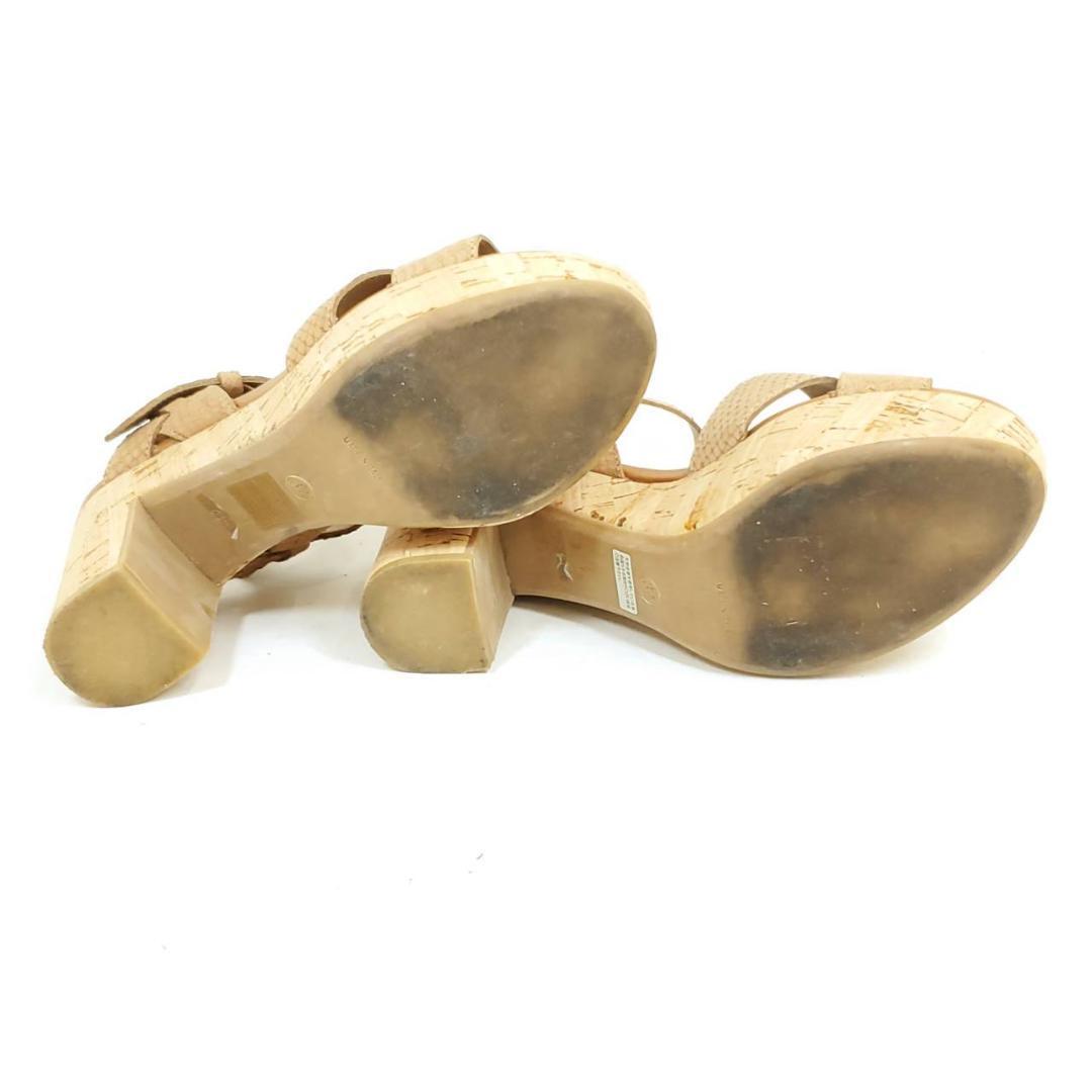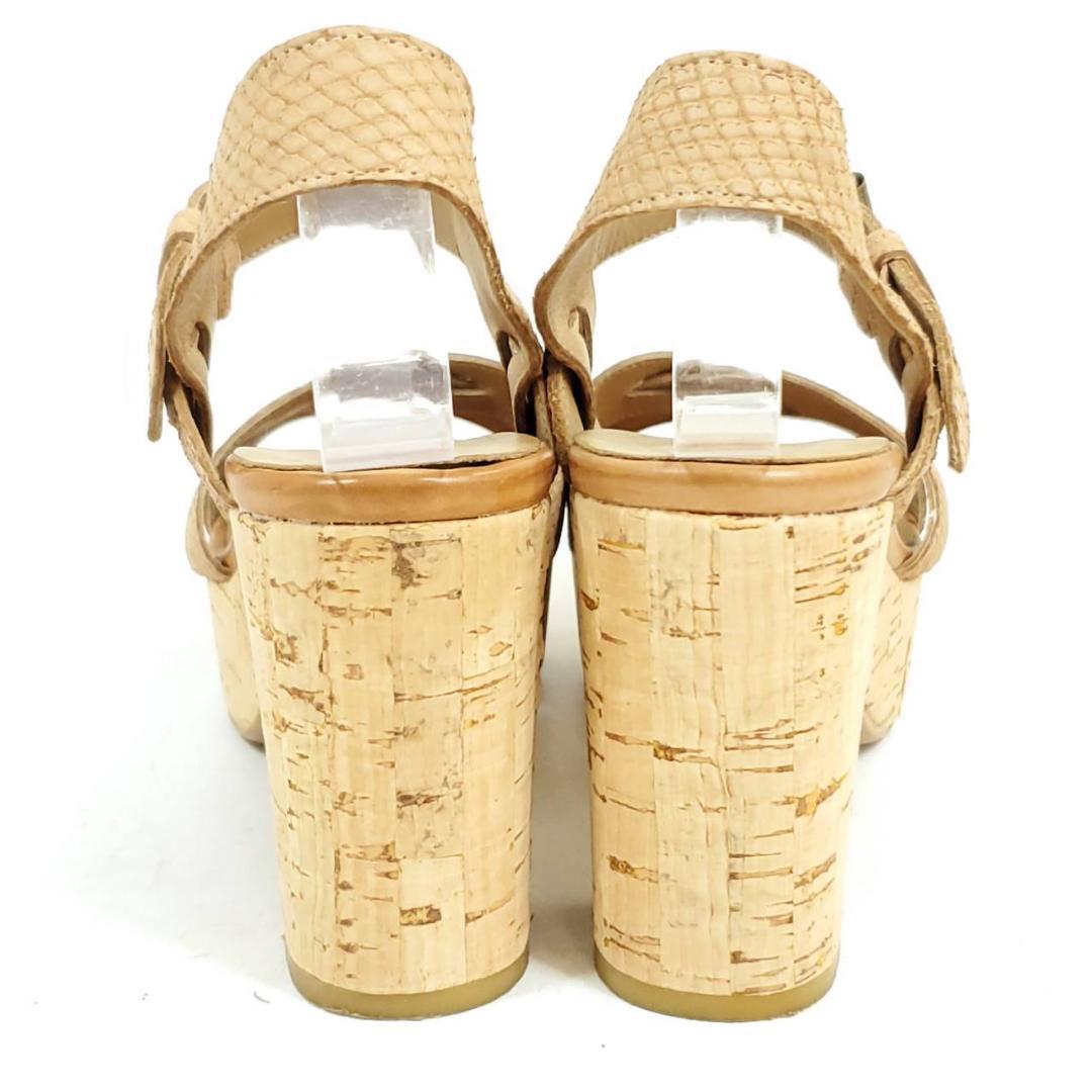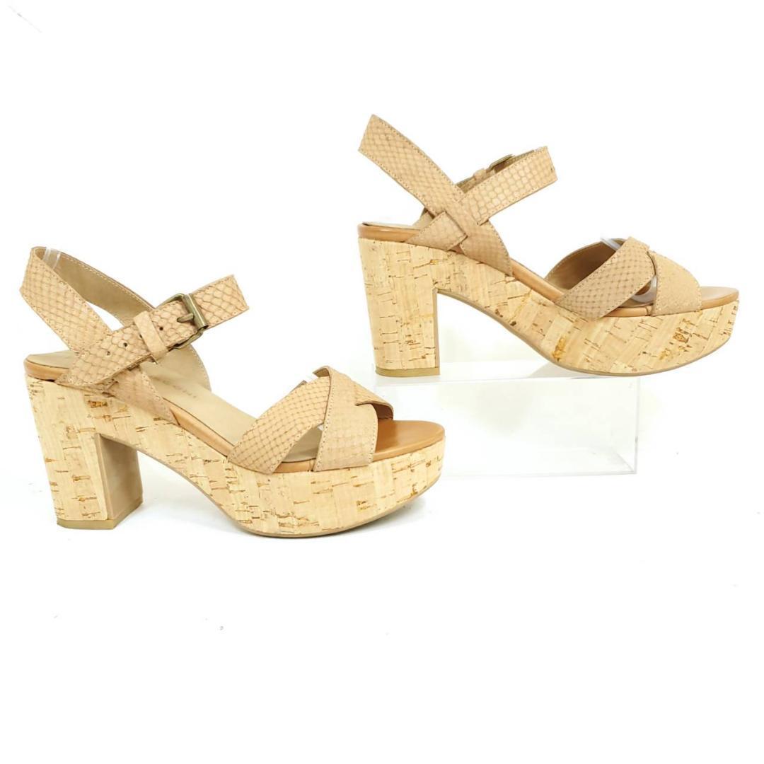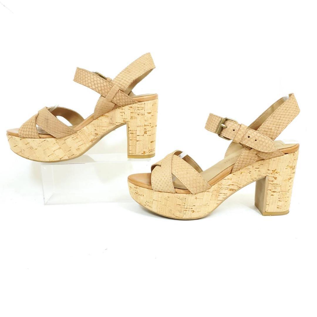 夏らしいコルクヒールに、クロスデザインの型押しレザーが上品&爽やか。