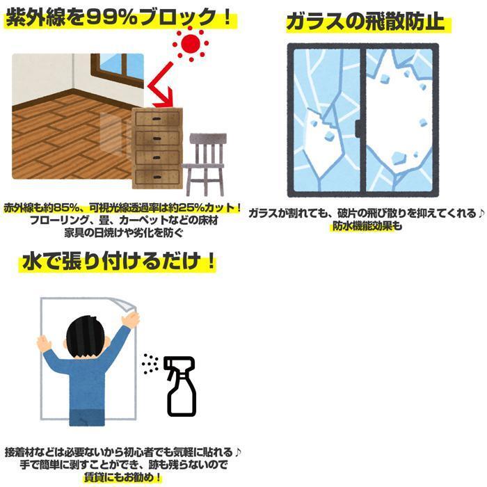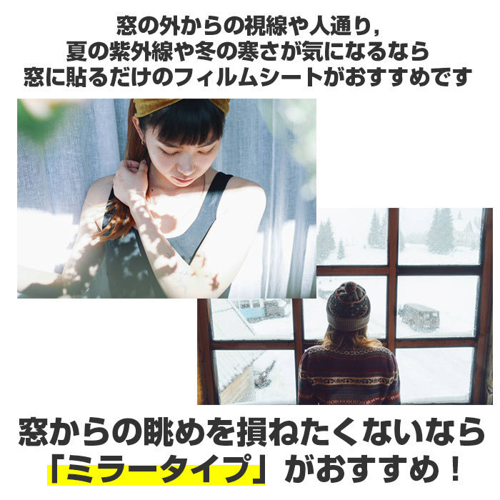 | 商品説明 | ・水で張り付けるだけ!繰り返し使用することが可能なマジックミラーフィルム。 ・接着材などは必要ないから初心者でも気軽に貼れる♪手で簡単に剥すことができ、跡も残らないので賃貸にもお勧め! ・紫外線を99%ブロック!赤外線も約85%、可視光線透過率は約25%カット! ・高い断熱・遮熱効果があり、冷暖房の費用を削減。夏は外からの熱を遮断し、冬はお部屋の暖気を逃がさない! ・フローリング、畳、カーペットなどの床材、家具の日焼けや劣化を防ぐ。 ・昼間は外からは鏡のように見え、室内からは外の様子を見ることができる、マジックミラー効果。(※夜間は外から室内が見えます。) ・室外からは雲や周りの景色が反射されて見えるので、ご自宅をお洒落に彩るエクステリアとして。 ・ガラスの飛散防止や防水機能効果も。いざという時も窓ガラスを保護♪ ・フィルムは室内側から張り付ける、内張りタイプです。 |