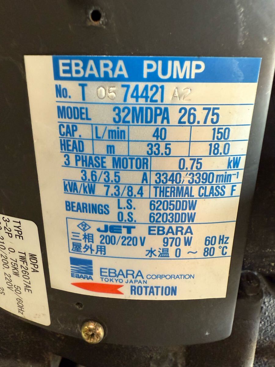EBARA PUMPエバラ/ 荏原製作所 【32MDPA26.75】陸上ポンプ 渦巻ポンプ 200/220V 970W 60Hz 中古品 通電OK モーターが回転