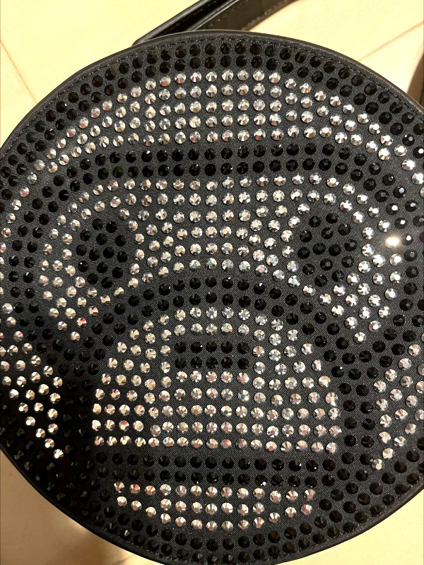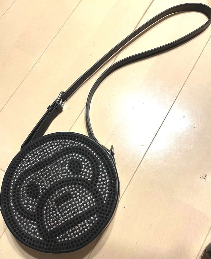 スワロフスキー装飾の猿顔デザインの円形ショルダーバッグ。 タグなし新品 サイズ 直径19cmくらい マチ7cmくらい