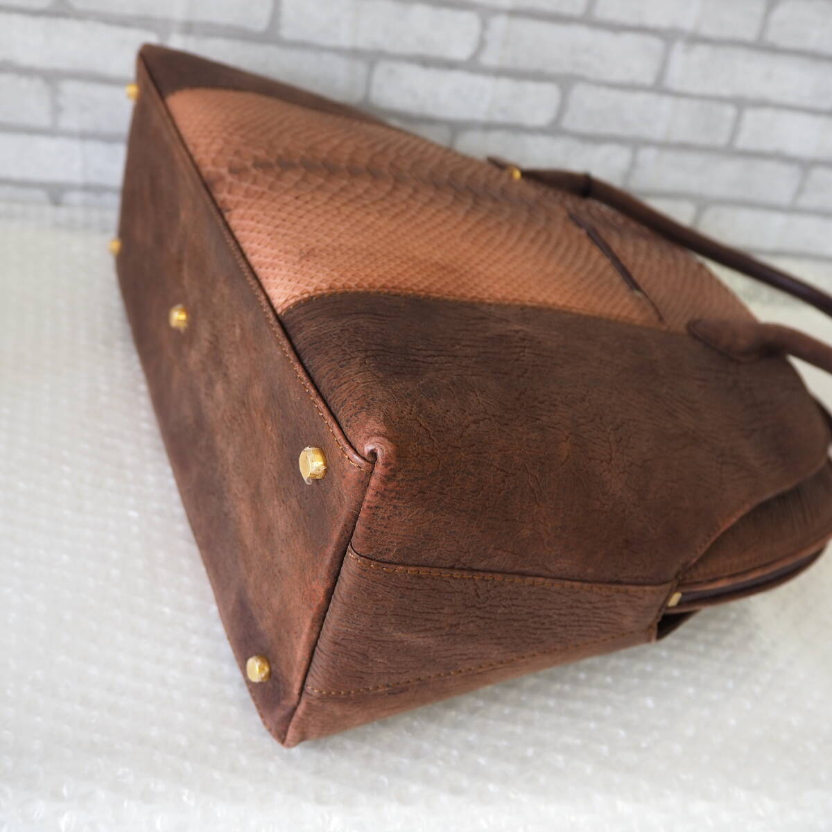 ◆未使用品*パイソン×シャーク*大きめ*レザー*ハンドバッグ*A4*ブラウン◆