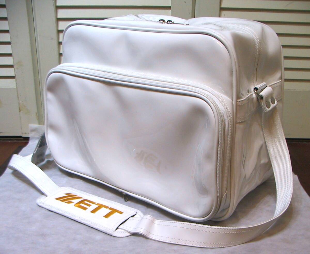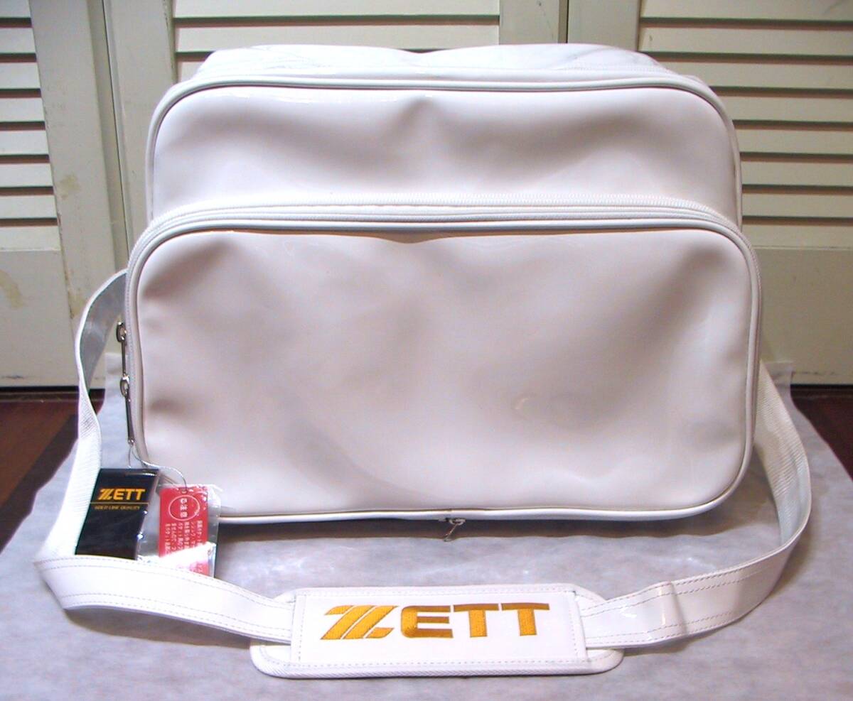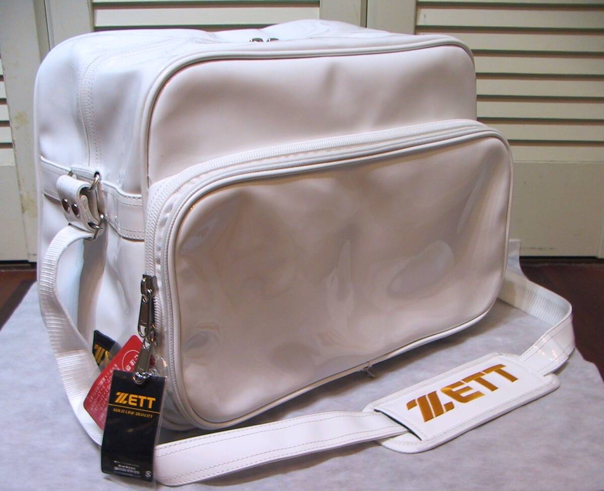 ゼット ZETT 野球用 ショルダー付きバッグ/肩掛けセカンドバッグ、色は白/ホワイト、エナメル製です。内側には中敷板ございます。新品未使用タグ付き、自宅保管のお品です。サイズ:縦34㎝x横45㎝xマチ25㎝、ショルダーの長さ76~138㎝x幅3.8㎝。仕様:ファスナー開閉、内側オープンポケット1つ、外側ファスナーポケット2つ。送料はゆうパック2080円(北海道2650円、沖縄2490円)になります。値下しました!