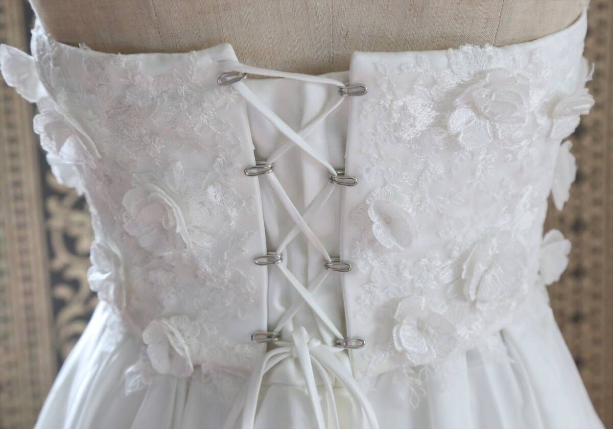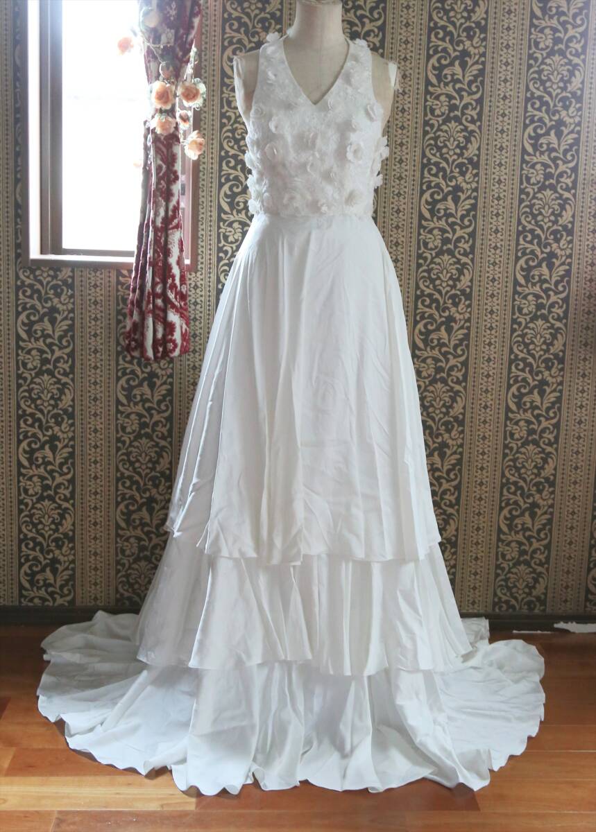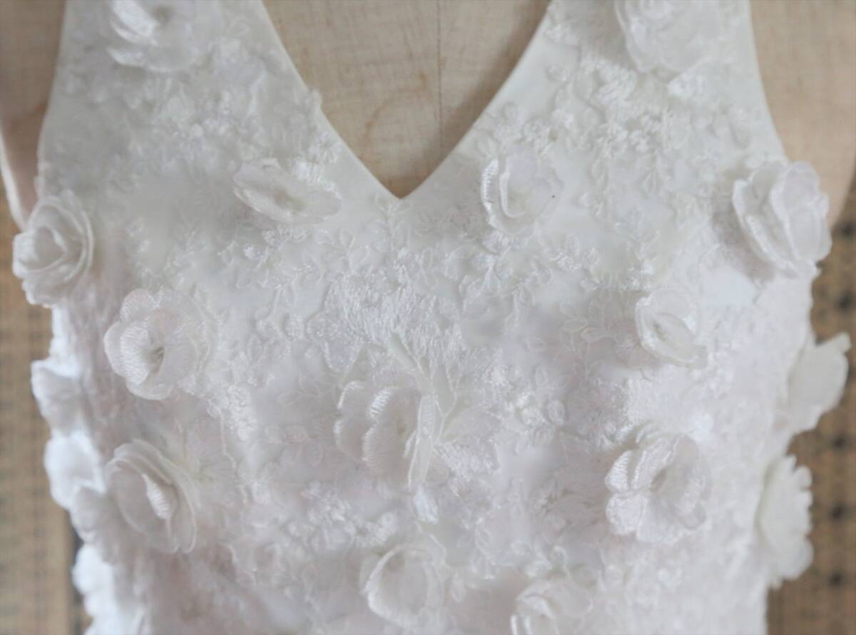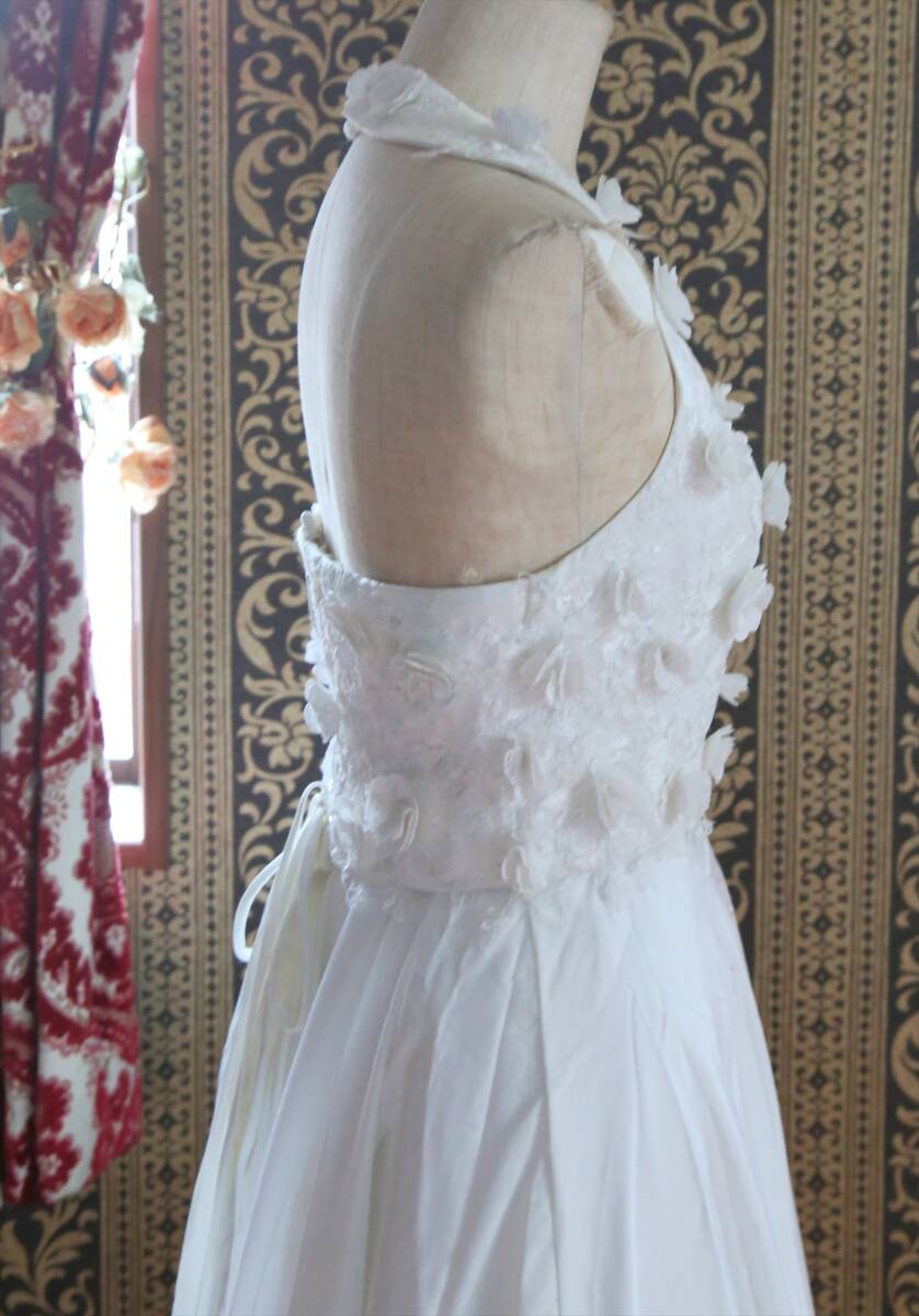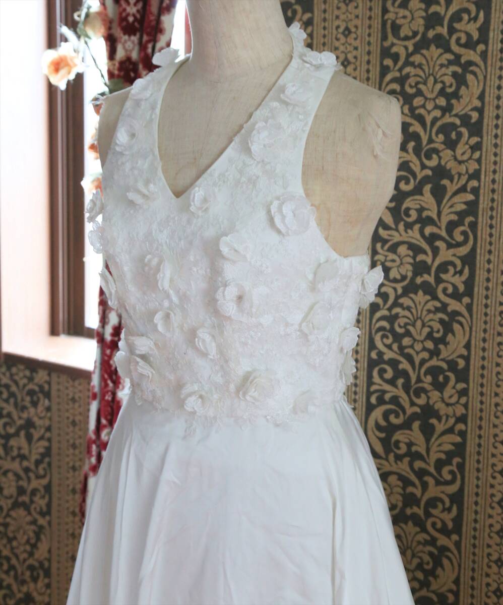 生地はテロンとしたサテン生地、上半身は刺繍のお花などで装飾されています