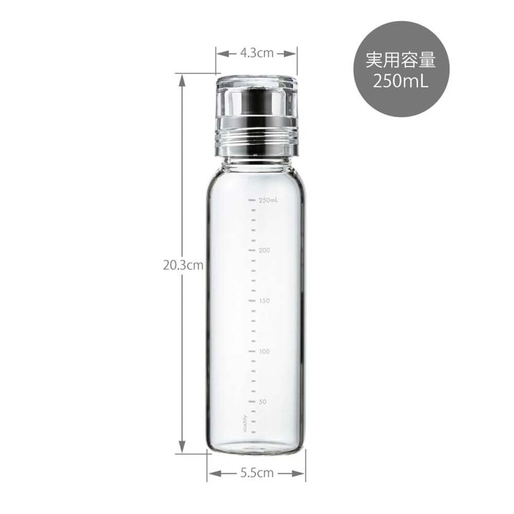 【商品詳細】本体サイズ:幅5.5×奥行5.5×高さ20.3・口径3.7cm、本体重量:約237g、実用容量:250mL、本体材質:本体/耐熱ガラス・フタ/PCT樹脂・注ぎ口/シリコーンゴム