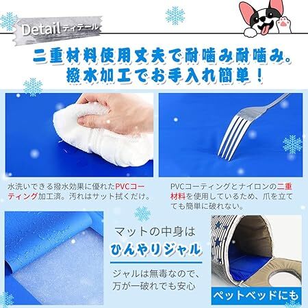 噛み癖のワンちゃんが結構いるんで、こちらのひんやり涼感マットはナイロンとPE膜の2重で作られてるので
