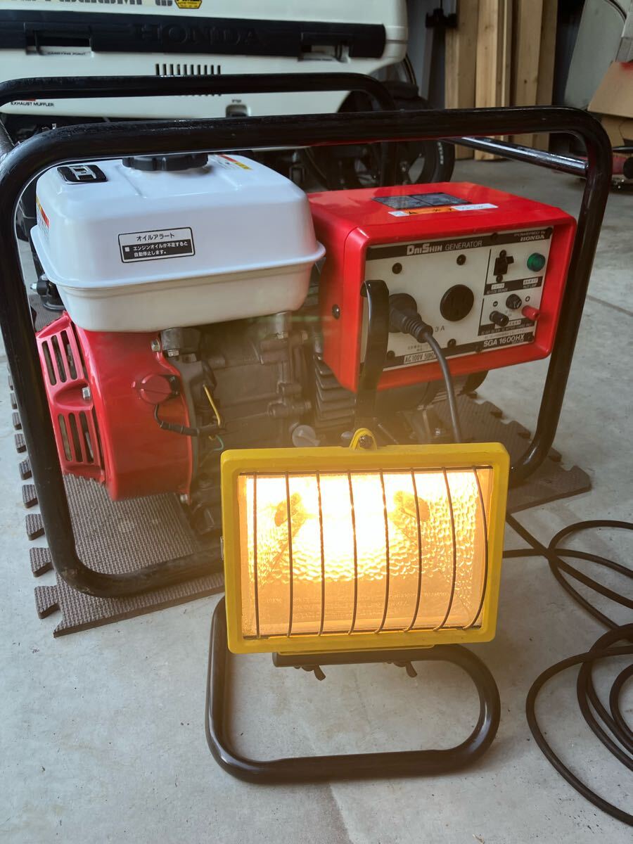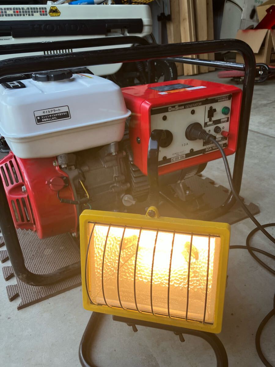 エンジンはリコイルで問題なく回り、一応作業灯を繋いでテストしました。オイル交換済、エアフィルター交換済、プラグ交換済、キャブレター清掃、マウント接続部のジェネレータケース修理跡有り、燃料タンク塗装跡有り