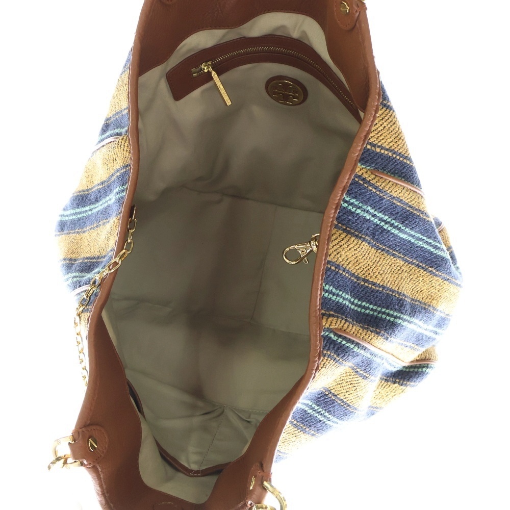 TORY BURCH トリー バーチ マルチストライプ ロゴモチーフ レザー切替 トートバッグ ブラウン/ネイビー/ブルー レディース