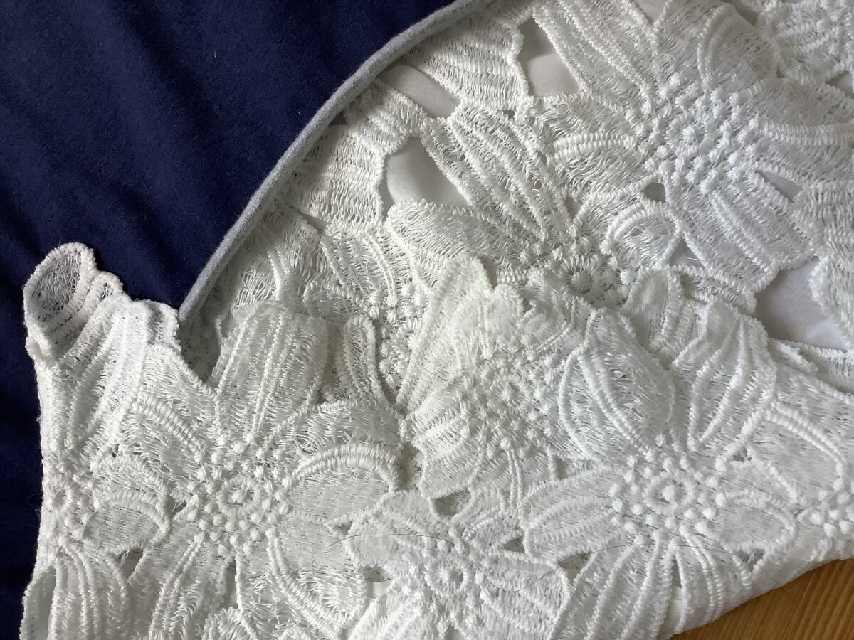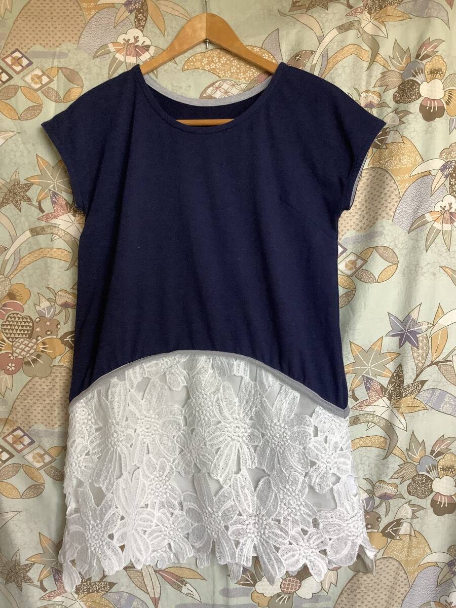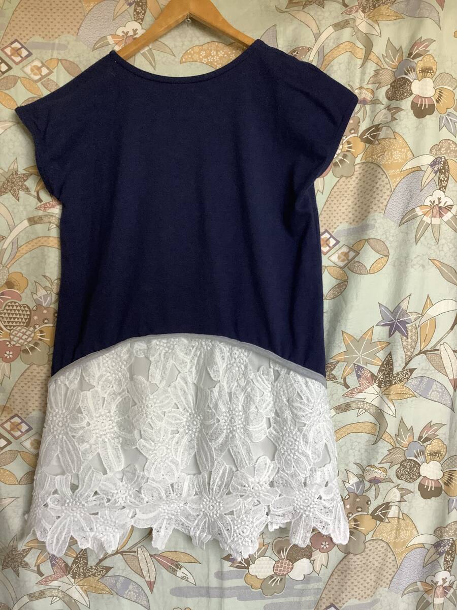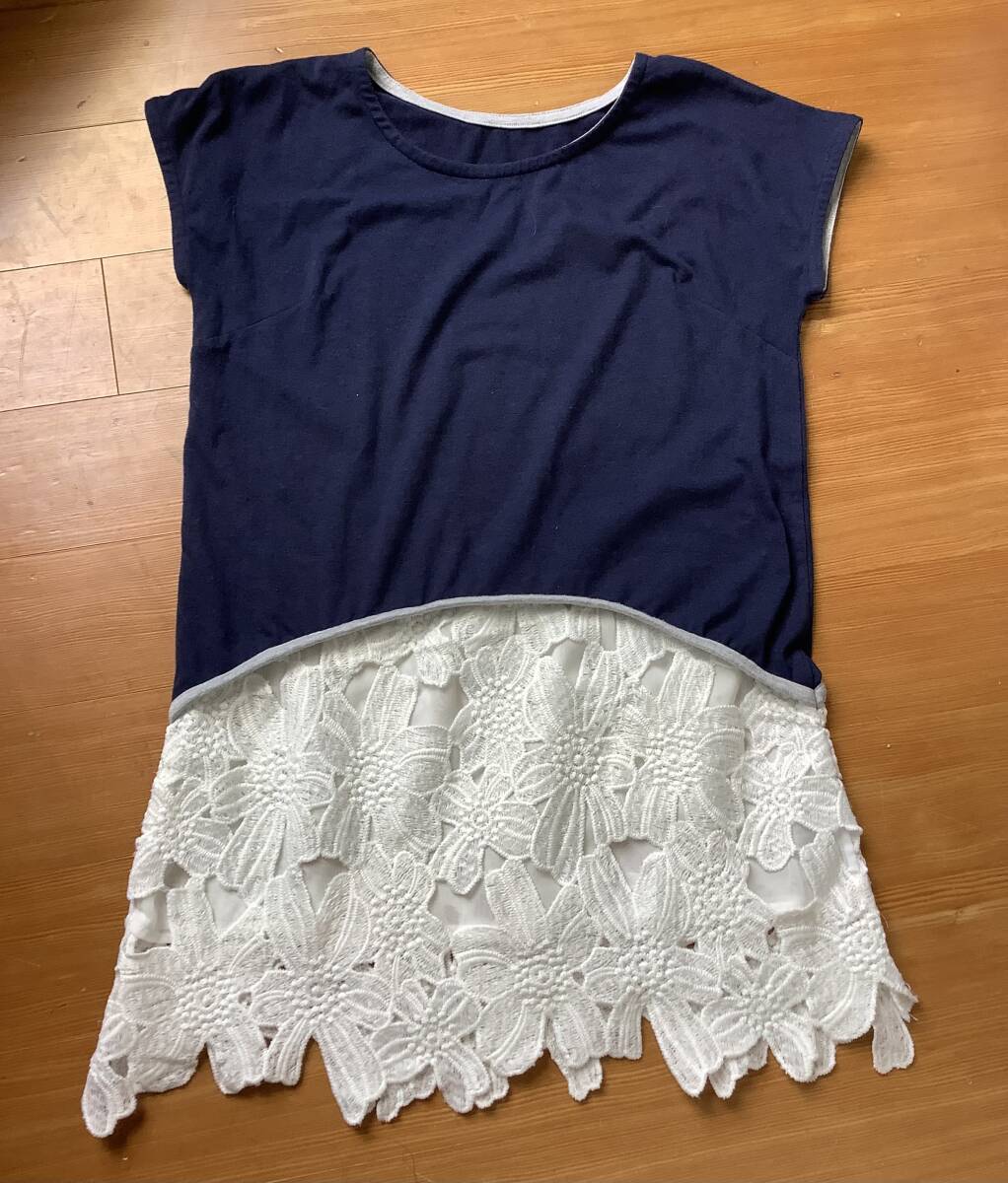 送料無料!美品。裾レース付きカットソーチュニックエレガント11号〜13号くらいネイビー