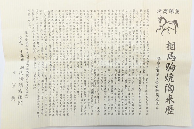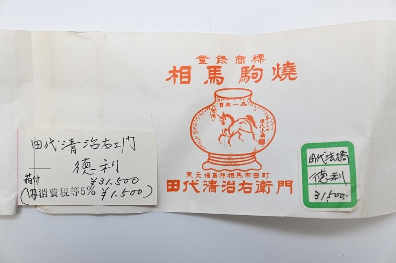 ■十五代 田代清治右衛門[田代法橋] 徳利 ■ ■ 走り駒 徳利 [馬文]相馬駒焼 裏印 ■ ■ 酒器 陶磁器 栞 未使用 共箱入り■ サイズ : 径約8.3cm × h約 12.3cm 共箱サイズ: 約10.4㎝× 約10.6cm ×h約16cm お目に留めて頂いた方へお譲り致します。 本日のお買得品のお仲間にいかがでしょうか。 ※ 画像以外の付属品はありません。 ■整理品 お品物の保管状態から、長期保管未使用品と思われます。入手状態でお譲り致します。 綺麗でありましても、新品新品同様ではありませんの で経年・保管状況による多少の擦れ・触り痕・汚れ等はご承知おき願います。 お品物は、31,500円のお品でした。 画像からご判断頂ける方、しばらくの間眠っていた 古いお品物とご理解頂ける方のみご検討願います。 ご入用の方へ! お見逃しなく! ■ご案内 お品物は、経年中古品現状渡しでございます。新品ではありません。 ノークレーム・ノーリターンとさせていただきます 。 ※画像に付きましては、お使いの環境モニター、ブラウザ等の違い、光反射の影響等によ り色の見え方が実物と 異なる場合がございます。予めご了承願います。 又、タイトル・コメントはあくまでも主観です。見落としなどがあるかもしれませんので ご参考程度とお考え願います。 お品物に関する情報は、箱やお品物上にあります印刷・記載等から 拾っております。 未使用と思われるお品物でありましても、中古で入手しているお品でございますので メーカー等の本物 保証をするものではありません。 尚、見解には個人差がございますので神経質な方はご入札を御控え願います。 検索ワードとして、タイトルには出品商品と関連のない単語も含まれる場合があります。 ご注意:評価が著しく悪い方、新規IDの方の入札・ご落札を削除する場合がございます。 ※ 採寸誤差、誤認、誤記等につきましてはご容赦願います。 紙箱 共箱等納品の場合は基本的に古さがございます。劣化、書き込み等がある場合もございます。 完璧ではありません。 ■お取引について 10910 2日以上ご連絡を頂けない場合はキャンセル致します。 お支払いは、落札後3日(72時間)以内にお願いしております。 |