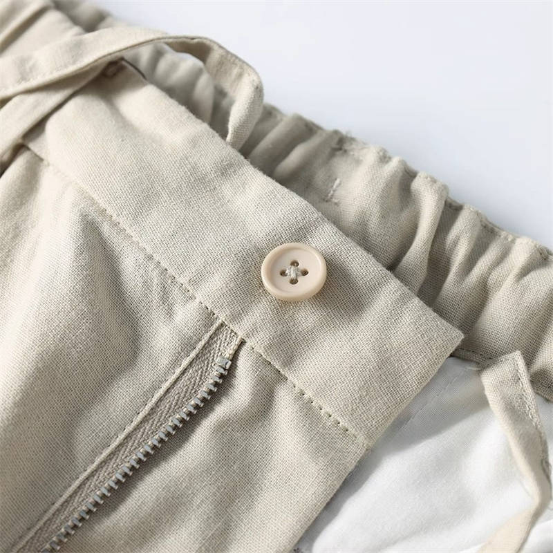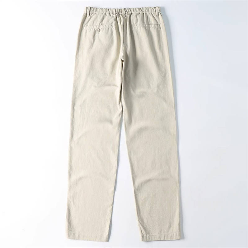 綿麻混紡素材/軽やかで柔らかい肌触り/さらりとした清涼感/高い通気性・吸湿速乾/ドライな着心地/抗菌・防臭・防虫・UVカット機能/シャリ感とハリ感のある風合い/型崩れしにくい/耐久性◎/洗うほどに柔らかく快適に/清涼感が増す着用感/テーパードシルエットで美しいライン