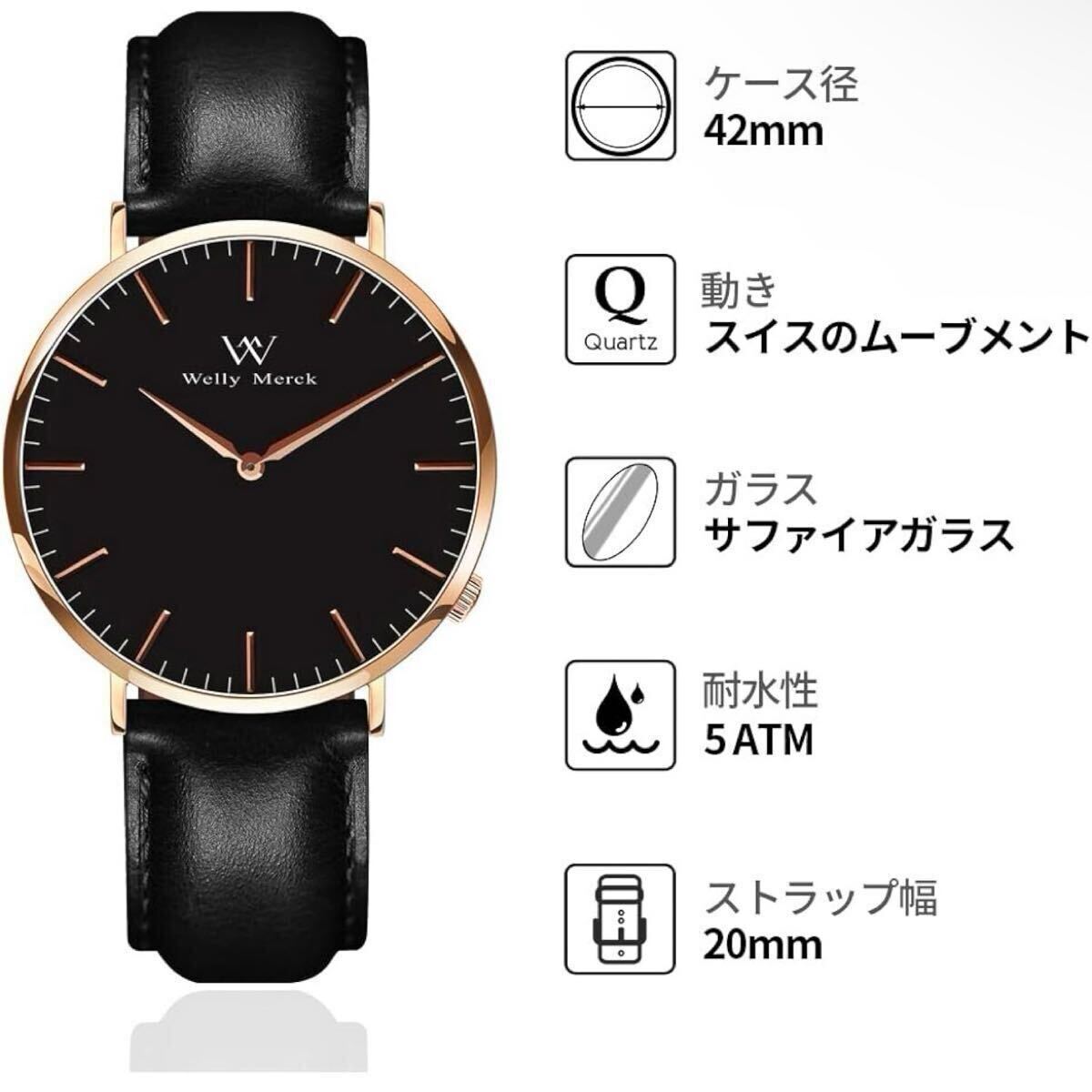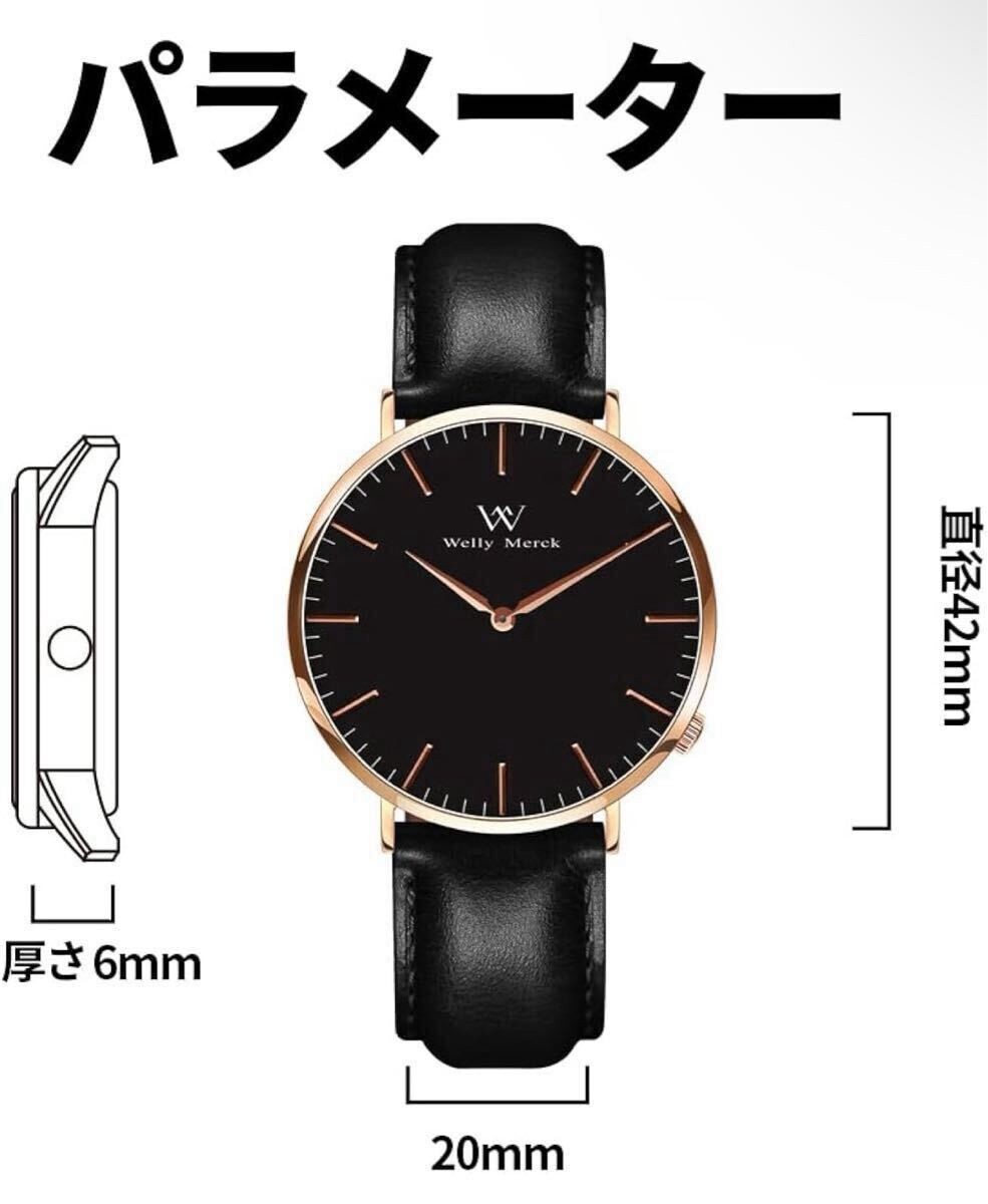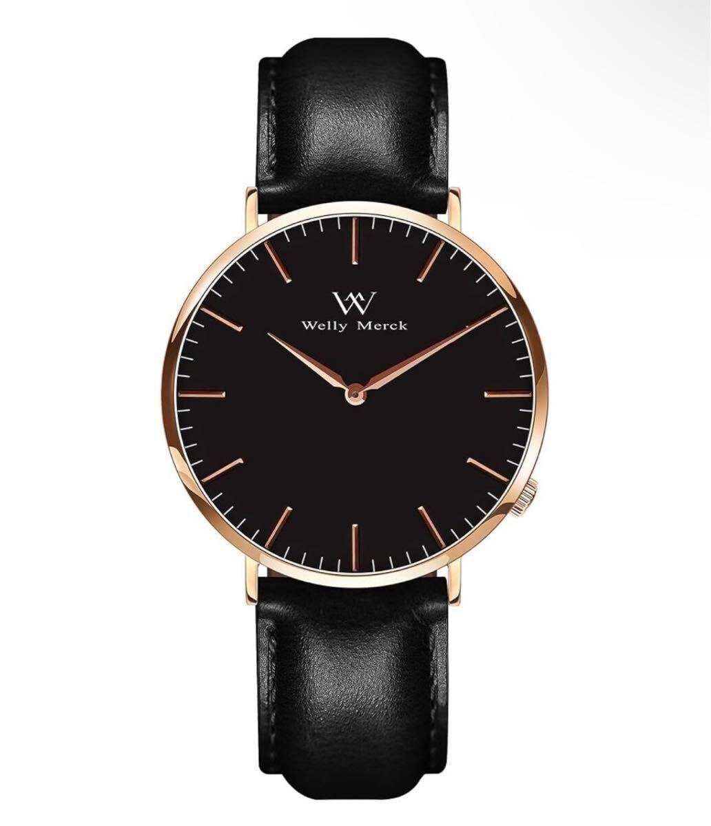 WM Welly Merck 時計 メンズ スイスブランド ビジネス サファイアガラス スイスクォーツ 42MM黒文字盤 20MM ブラックレザーベルト 日常生活防水