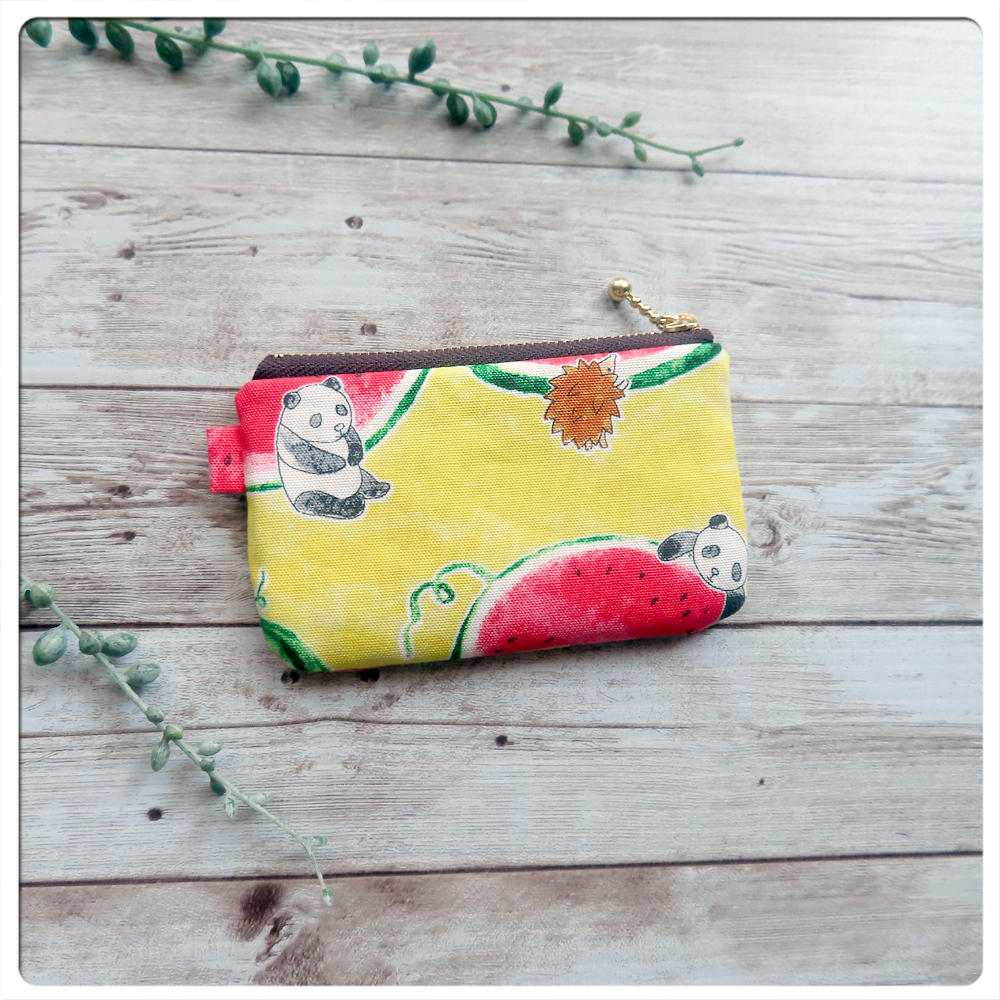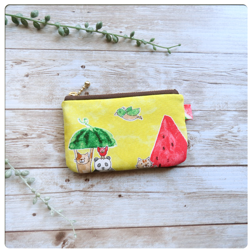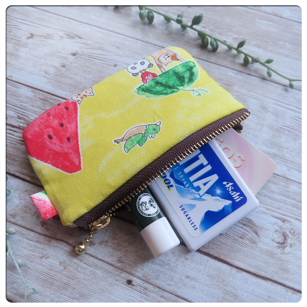 コットンオックスのイエロー地にスイカやアニマルが可愛いプリント生地を使ってハンドメイドした、小さなポーチです。