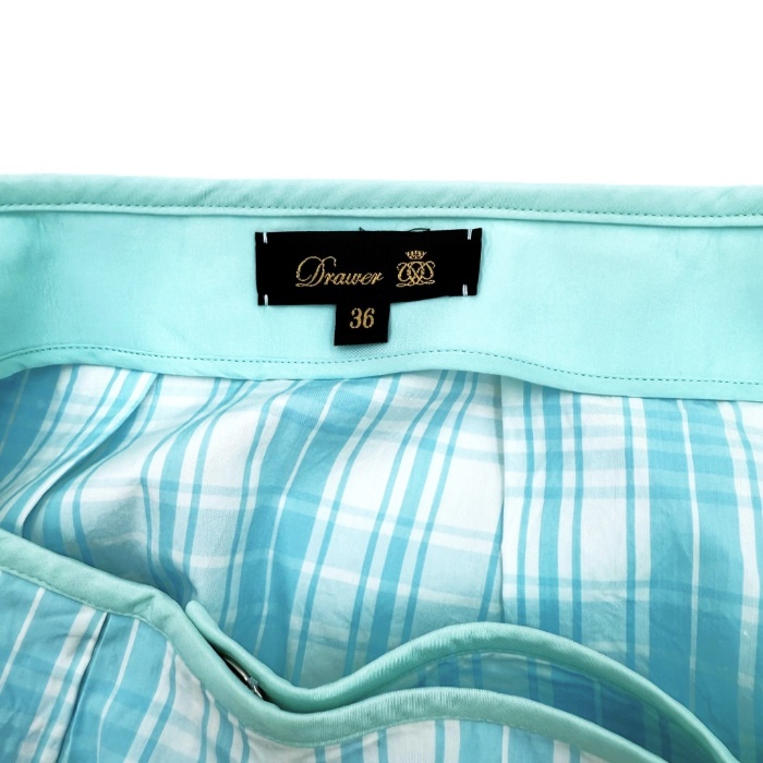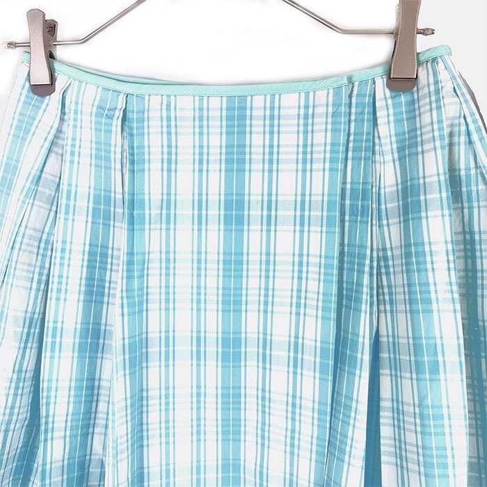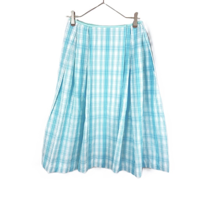 【コメント】 爽やかなライトブルーのチェック柄スカートです。巻きスカート風で可愛いシルエット。少し使用感はありますが、気になる汚れや傷みはなく、全体的に状態の良い綺麗なお品物です。 |