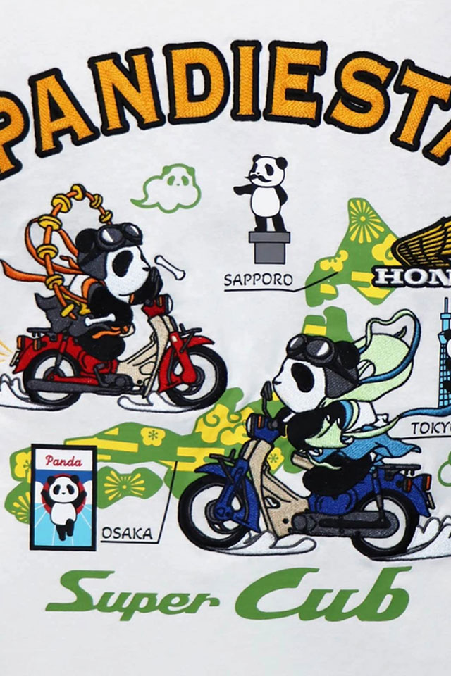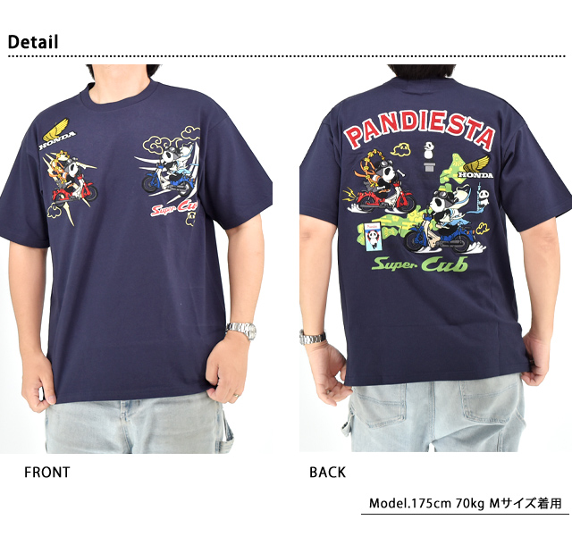 和柄ブランド【錦】の姉妹ブランドとして誕生した、お茶目なパンダをモチーフとした【PANDIESTA JAPAN】より「HONDA×PANDIESTA スーパーカブ風神雷神半袖Tシャツ(585507)」のご紹介です。 今や、錦の定番モチーフとなった「錦PANDA」!! 今回は、1985年の誕生から約60年以上にわたって人々に親しまれ、日本国内はもちろんのこと、世界中で愛用される『スーパーカブ』をテーマにした半袖Tシャツになります。 前後共に、スーパーカブに跨る熊猫風神&雷神を刺繍で施しており、彼らが守る日本列島は和テイストで描かれております。 シンプルになり過ぎてしまう夏のスタイリングに刺繍仕上げのTシャツはインパクトのあるアイテム。 柔らかくて肌触りが心地よい天竺素材は季節を問わずスタイリング可能な一枚です。 | |||||||||||||||||||||||||