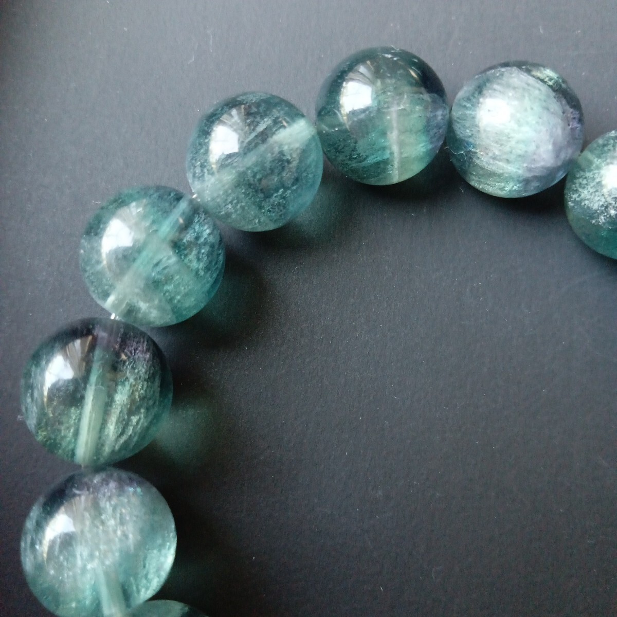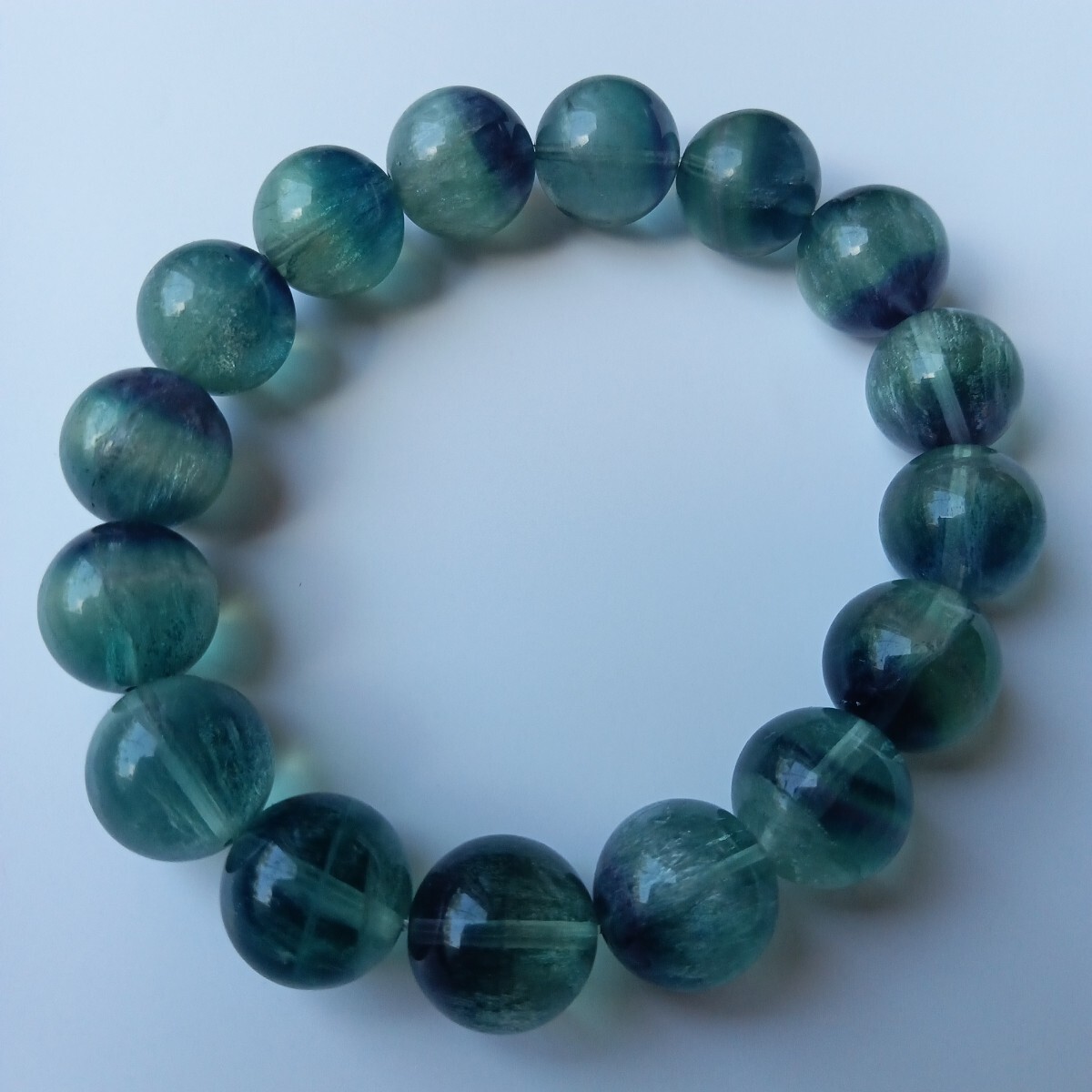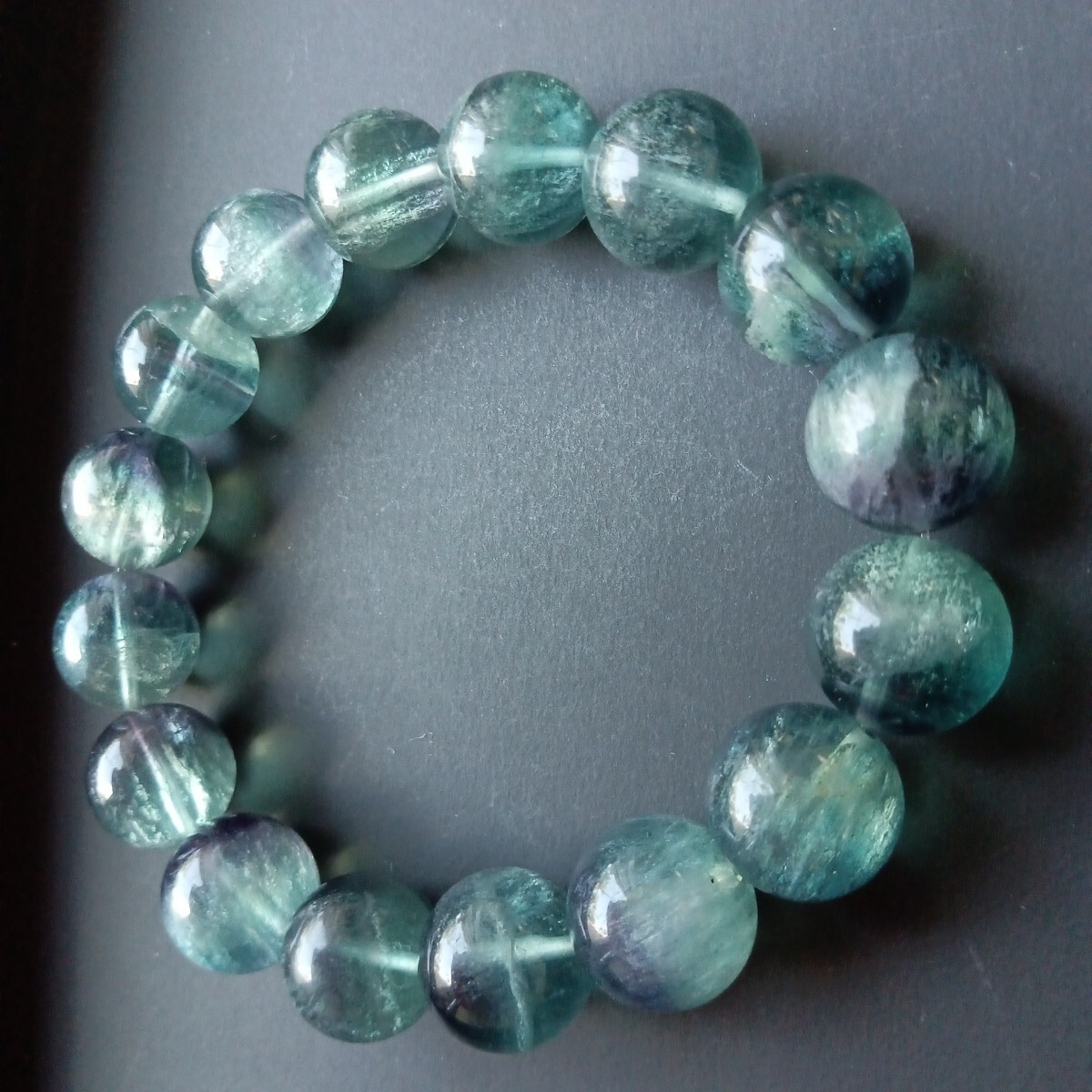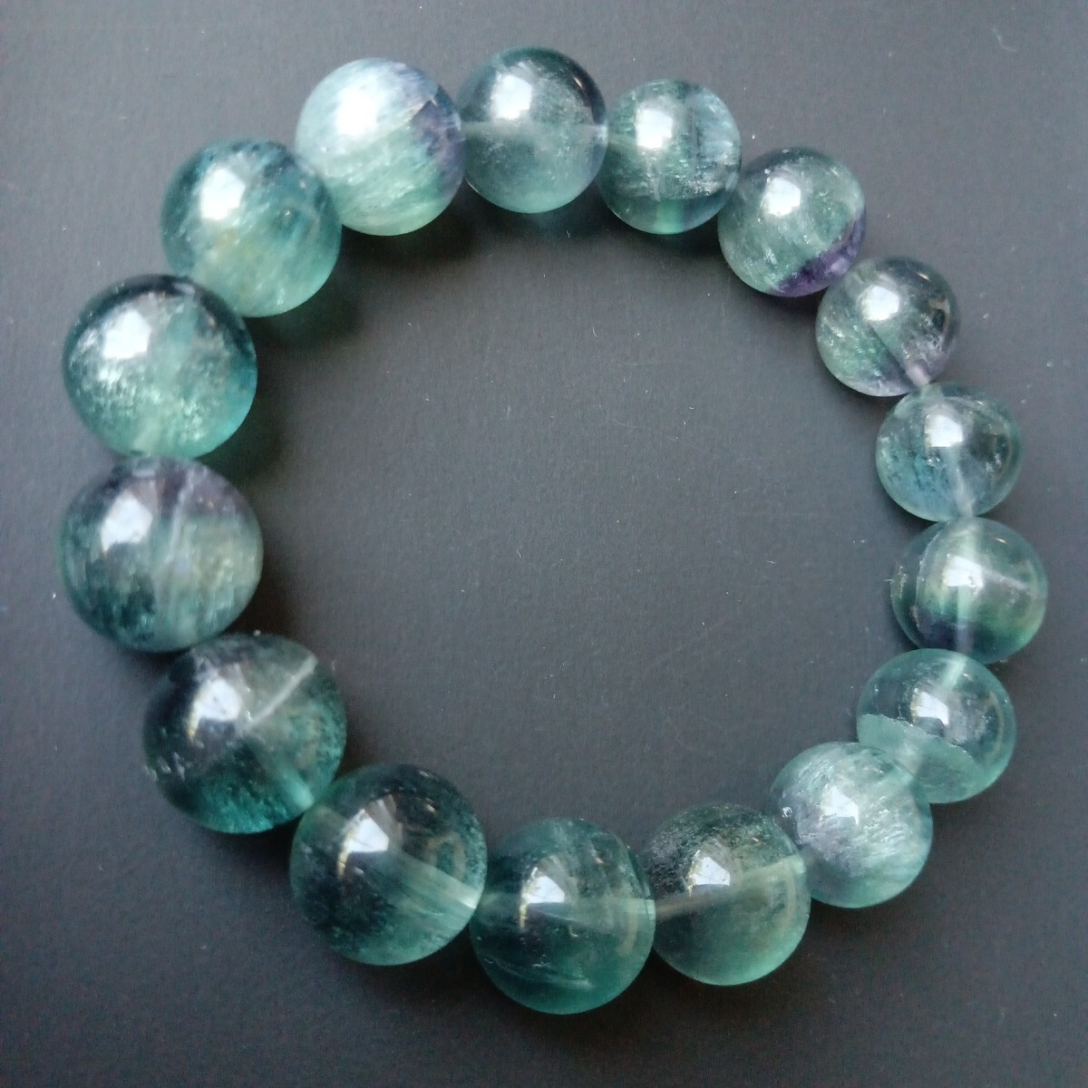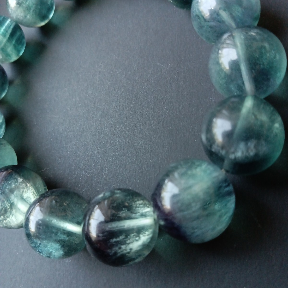 高品質フローライトの素敵なブレスレットです。ブルーグリーン・ピンク・ライトパープルなどが混ざりあった魅力的なバイカラーフローライトです。こちら、ブルーグリーン味の強いレアな大粒ストーンです。