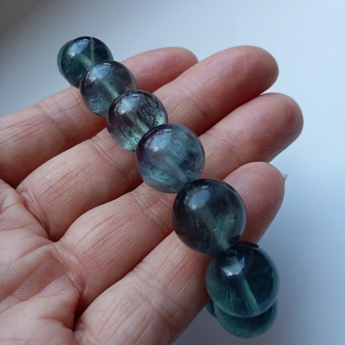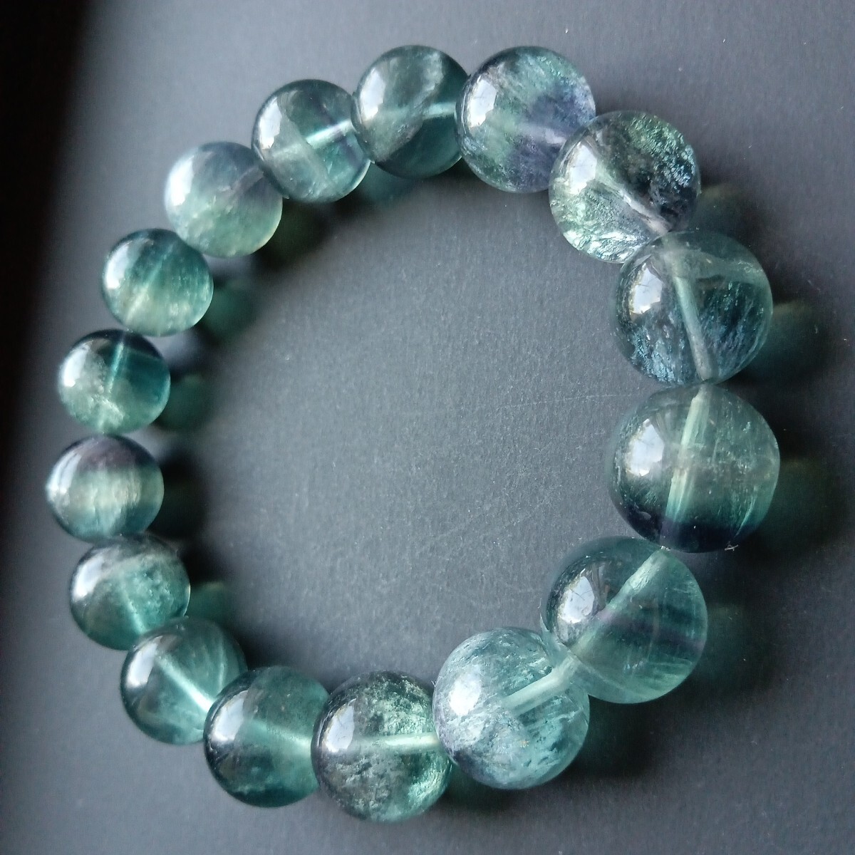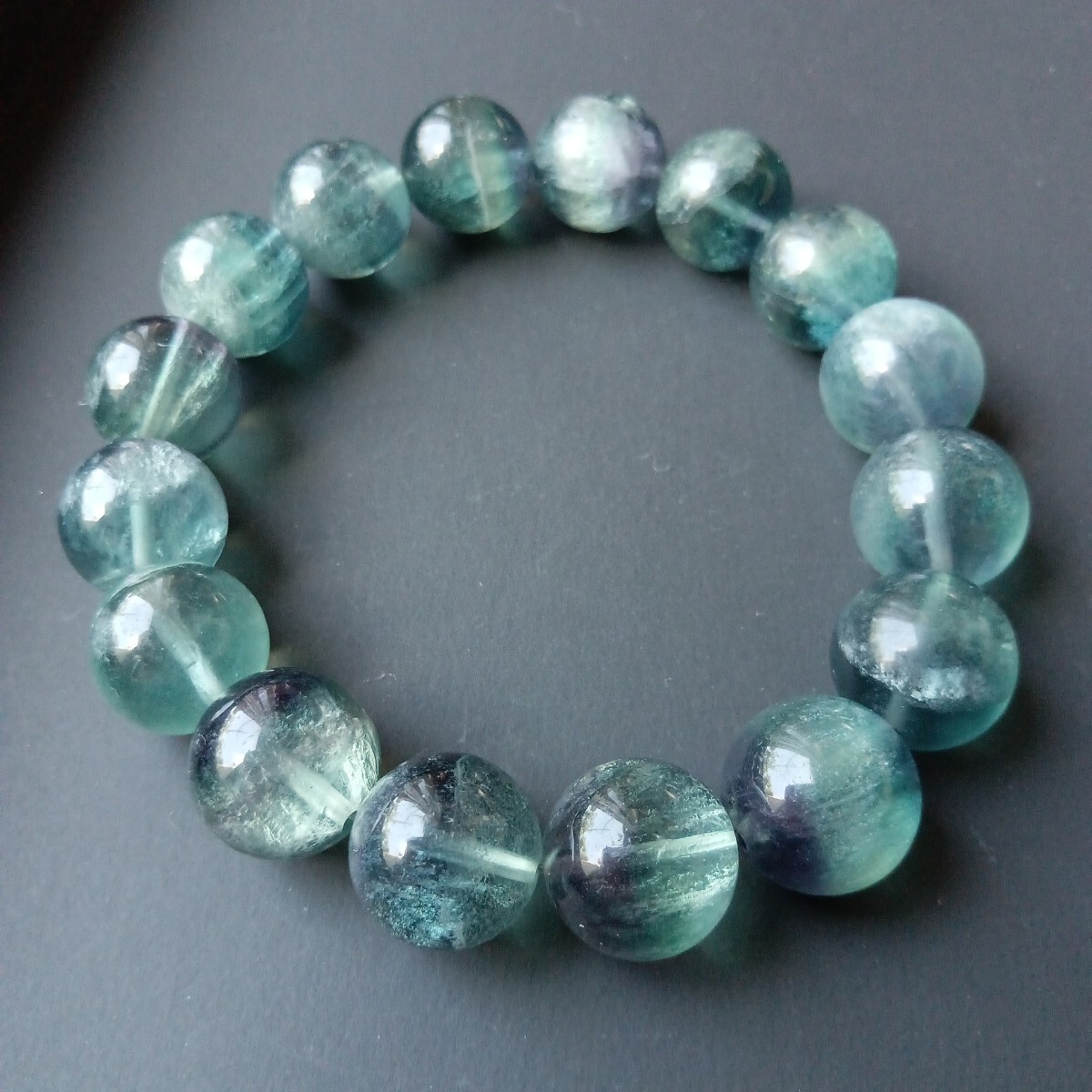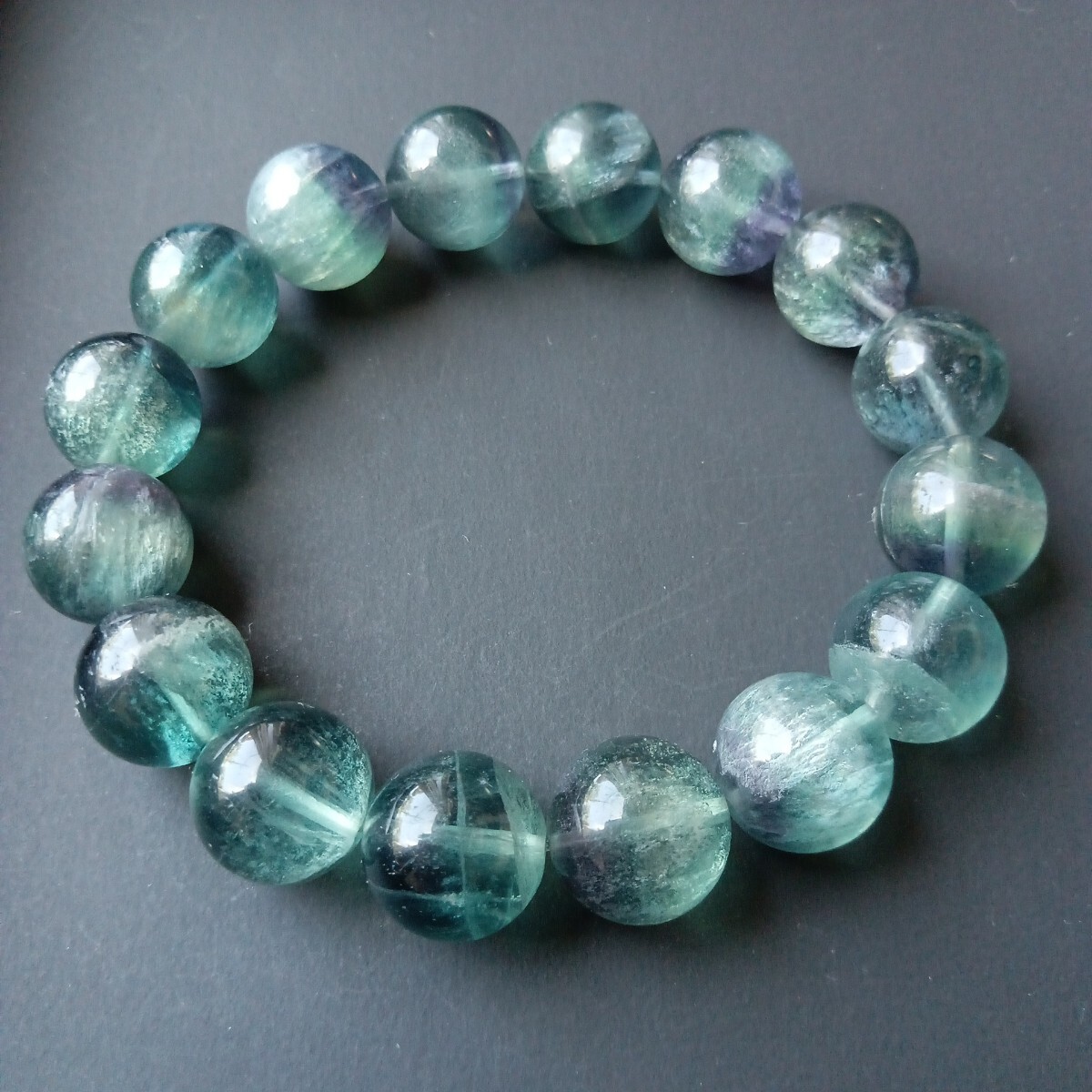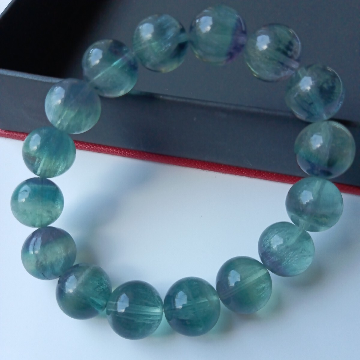 高品質フローライトの素敵なブレスレットです。ブルーグリーン・ピンク・ライトパープルなどが混ざりあった魅力的なバイカラーフローライトです。こちら、ブルーグリーン味の強いレアな大粒ストーンです。