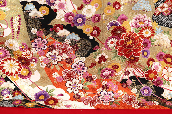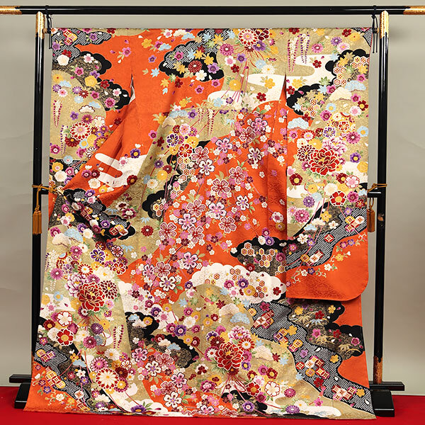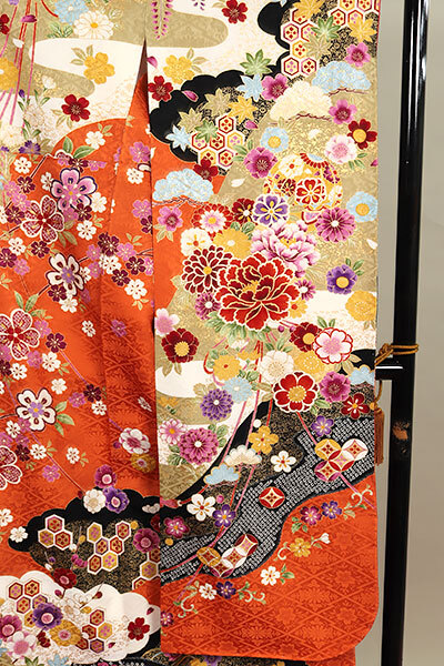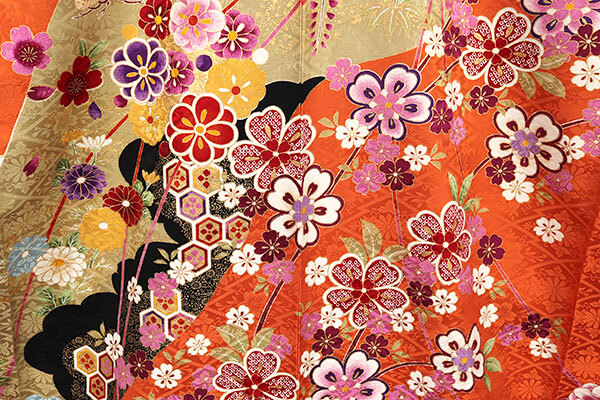 松皮菱文に桜と菊があしらわれた地紋入りの綸子地は、黄丹(おうに)色の上品なお色目でございます。
