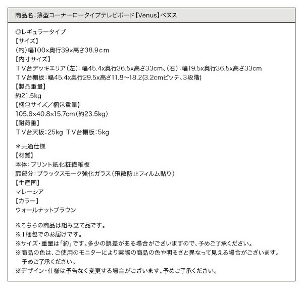 ![]() 薄型コーナーロータイプテレビボード Venus ベヌス レギュラータイプ ウォールナットブラウン ![]() ※お使いのブラウザ・モニター等の使用状況により色の見え方が異なる場合がございます。 ◇◆支払詳細◆◇ ◇◆発送詳細◆◇ ◇◆コメント◆◇ |