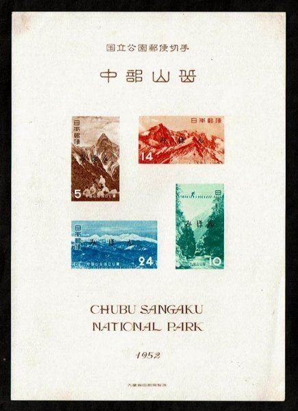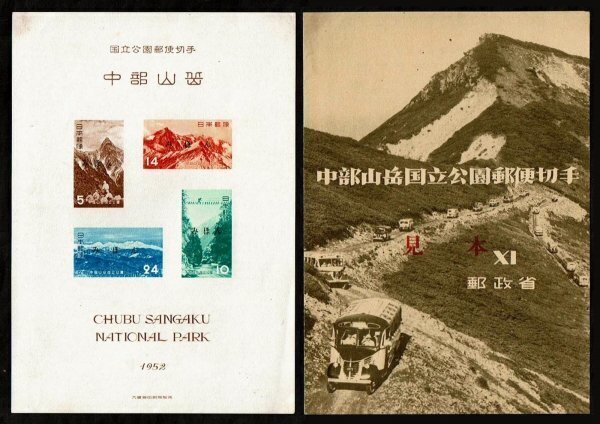 N677■【みほん字入り】1952年 第1次国立公園切手 中部山岳 小型シート(タトウ付き)■希少・良好