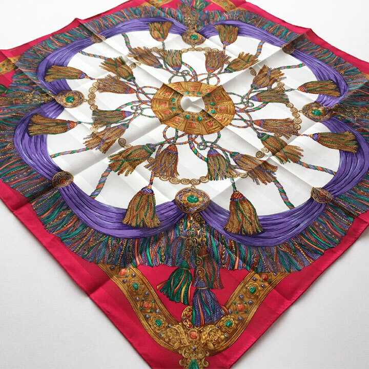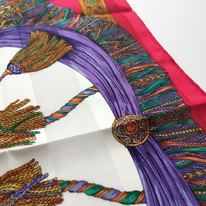 セリーヌ / CELINE ハンカチ タッセル&宝石柄 縦透かし 白/紫/赤ピンク【6370】