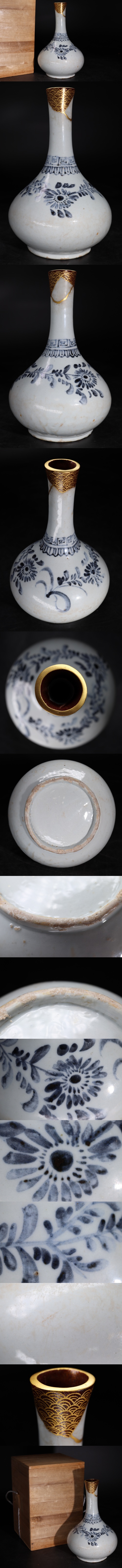 | 時代 染付 草花紋 徳利 金継ぎ 木箱付 / 朝鮮古美術 李朝 酒器 花器 花瓶 見立て 煎茶道具 .G1998 |