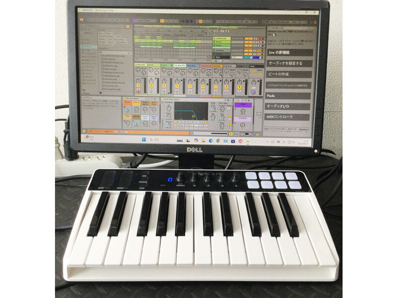 USBミニDINケーブルでパソコンと接続し、Ableton Live 12 Lite という音楽ソフトウェアで鍵盤の出音確認まで行っております。