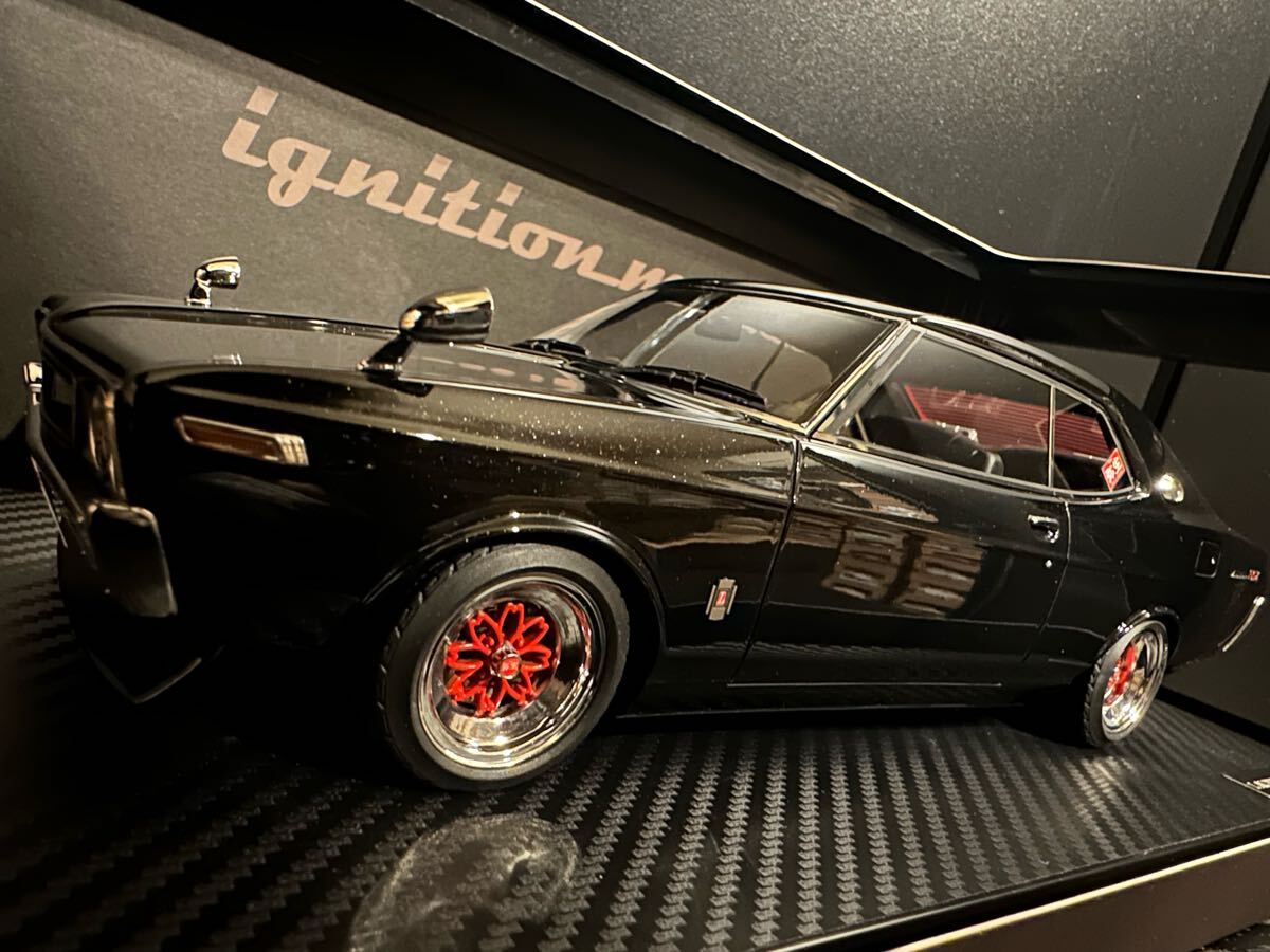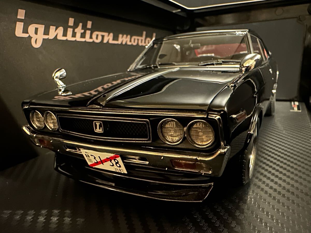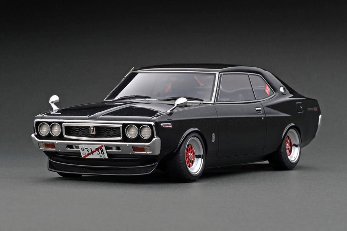 ローレル2000SGX (C130)後期型を1/18スケール レジンモデルで再現。ボディカラー:メタリックブラック/グリーン(偏光色)。弥生14インチホイールにローダウン仕様。