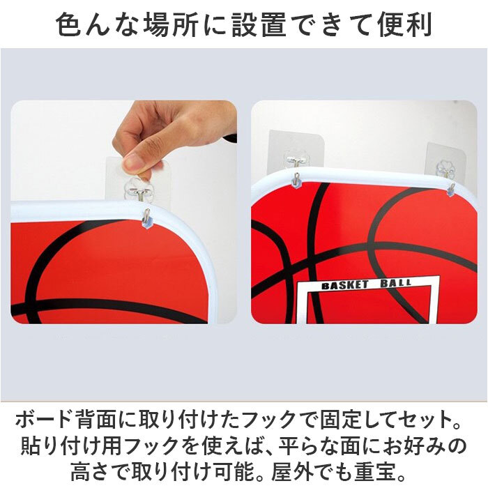 | 商品説明 | ・・自宅でも手軽にシュート練習できる、バスケットゴールセットが登場。 ・【どなたでも簡単セッティング】 ・付属のドライバーやレンチを使って、簡単組み立て!あっという間にミニゴールの完成☆ ・【色んな場所に設置できて便利】 ・ボード背面に取り付けたフックで固定してセット。貼り付け用フックを使えば、平らな面にお好みの高さで取り付け可能。屋外でも重宝。 ・【お子さまも持ちやすいミニボール】 ・付属の空気入れで膨らますボールは、柔らかな素材&ミニサイズ。小さなお子さまも持ちやすく、当たってもケガの心配が不要。 ・【家族みんなで楽しくストレス発散】 ・天候に左右されず、子供部屋でシュート練習!家族が集まるリビングに設置すれば、みんなで遊べてストレス解消に◎ |