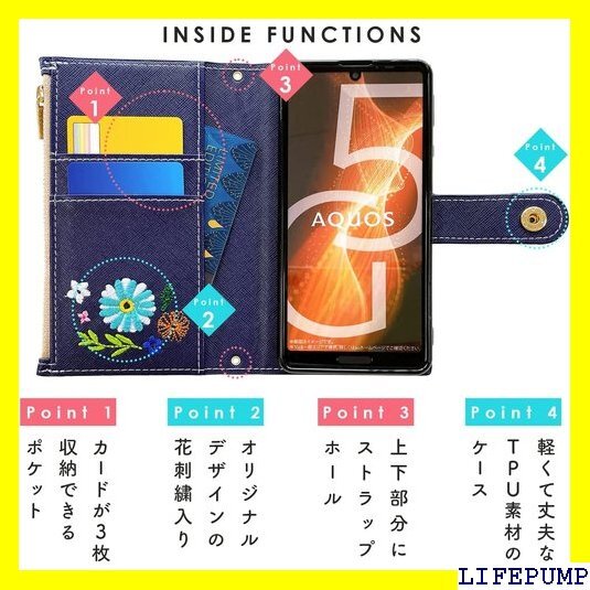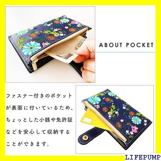 シンプルスマホ6 A201SH 専用 手帳型ケース。小銭や免許証等の収納に便利なファスナー付きの手帳型ケースです。上品なサフィアーノ生地に、色鮮やかな花柄の刺繍を施しています。