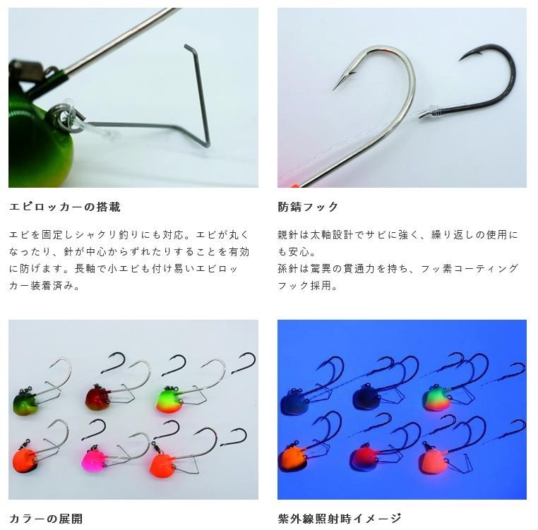 エビを固定しシャクリ釣りにも対応。エビが丸くなったり、針が中心からずれたりすることを有効的に防げます。長軸で小エビも付け易いエビロッカー装着済み。