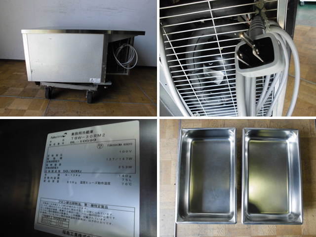 ・メーカー:フクシマ ・型番:TBW-30RM2 ・2018年製 ・管:B0553 ・電源:単相100V 50/60Hz ・冷媒:HFC R-134a/140g ・サイズ:W900×D750×H550mm ・引き出し内寸:W310×D610×深さ90mm ・製品質量:85kg ・有効内容積:75L ・フィルター(新品):1枚 ・ドレンホース:1本 ・ホテルパン:2個 【商品状態】 ・商品はUSED品です。 ・動作・適温チェック済みです。1H→0℃確認 ・清掃済みです。 ・USED品の為、傷・汚れ・錆・ビス穴複数ヵ所ございます。 ・写真の物がすべてです。 ・写真でご判断頂きます様お願いいたします。 【お支払方法】 ・銀行振込の場合は、Paypay銀行・大垣共立銀行の取り扱いとなります。 振込み手数料はお客様のご負担でお願い致します。 ・ヤフーショッピング各種支払方法に対応しております。 ・お支払い金額確定後、3日以内に商品代金+消費税+送料を御入金を下さい。 御入金確認後の発送となります。 【発送詳細】 ・日本通運での発送となります。 ・北海道・沖縄・各中継営業所が入る場合は、別途御見積となります。 ・大型商品のため、リフト、又は荷受人様数名が必要となります。 ご用意頂けない場合、又は個人の方への発送は営業所止めとなります。 ・法人の方は、必ず法人名をご連絡ください。 ・配達時間のご指定はできません。 ・元払い発送になります。