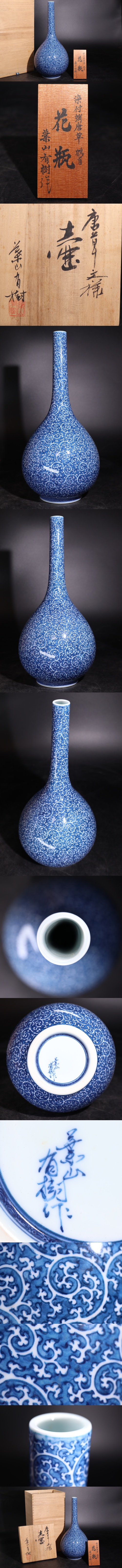 | 葉山有樹 作 「 染付 蛸唐草 鶴首 花瓶 」 共箱付 / 有田 花器 唐草 壺 煎茶飾 .G1972 |