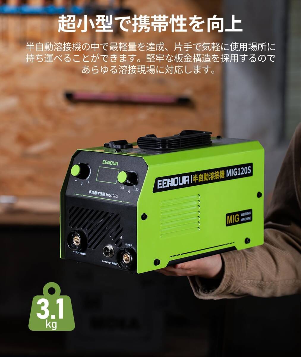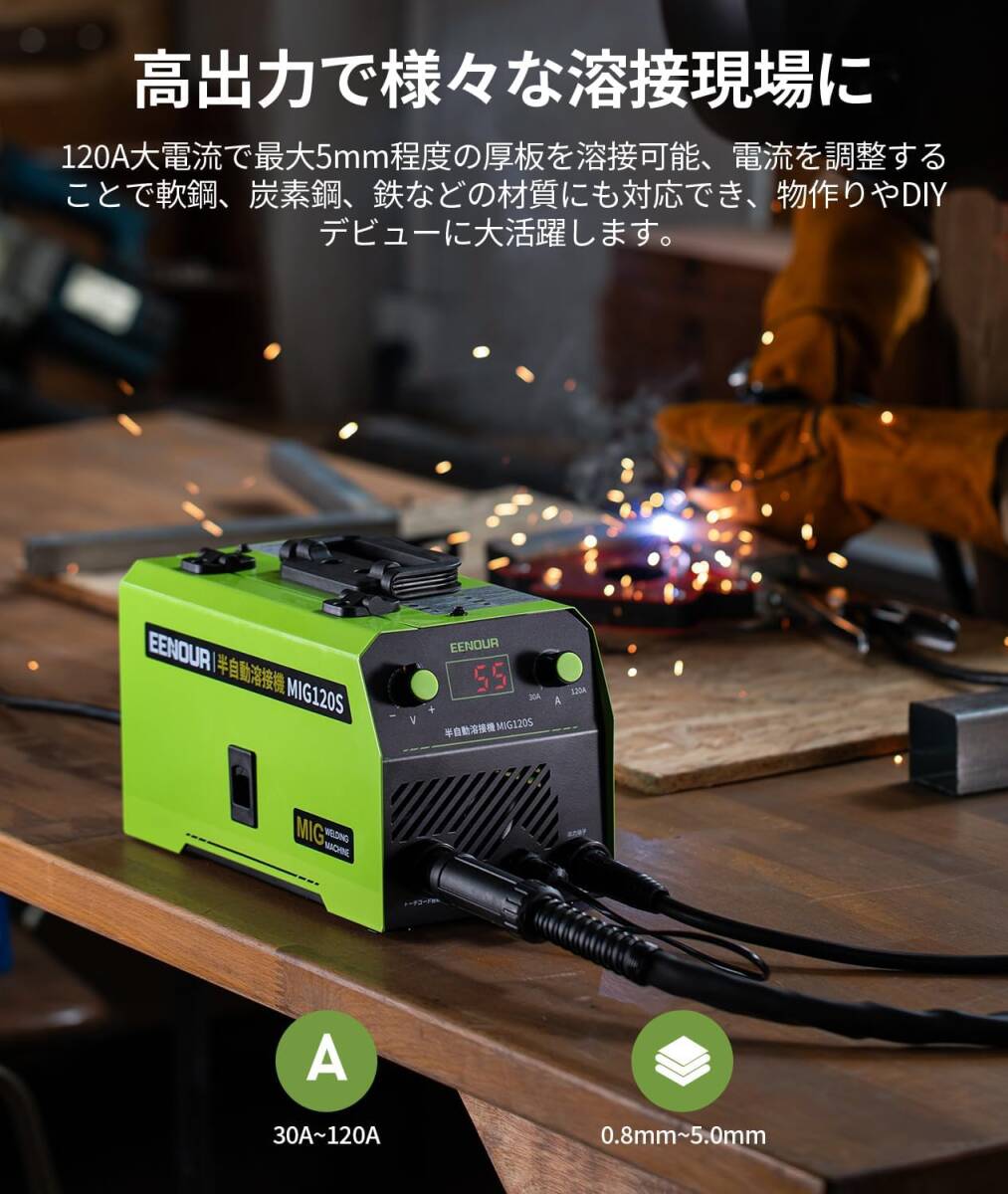 EENOUR 半自動溶接機 MIG120S 最大出力120A ノンガスMIG溶接 液晶表示 インバーター搭載 スパッタ少ない 100V専用 ノンガス溶接機 電流電圧調整可能 定格使用率30% 小型 軽量 家庭用 初心者向け 軟鋼、炭素鋼、鋳鉄等に対応 簡単な修理 家具・雑貨のDIYに大活躍
