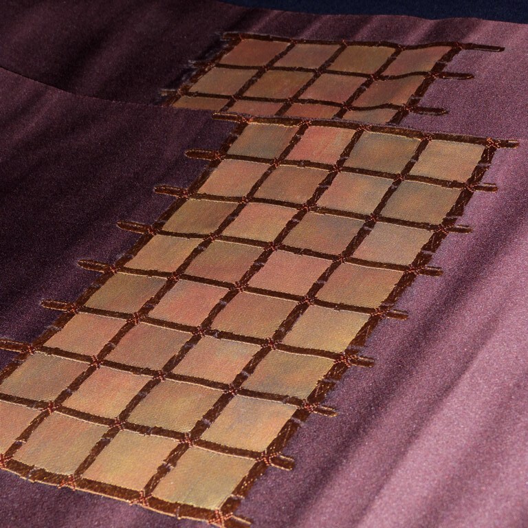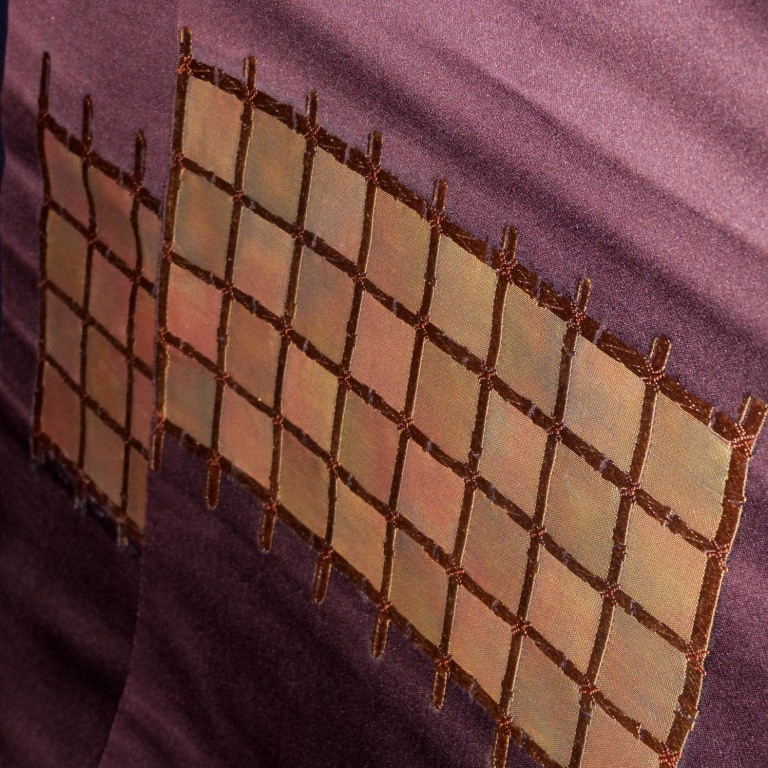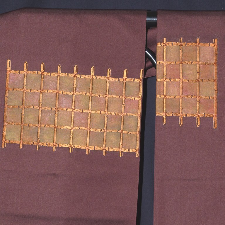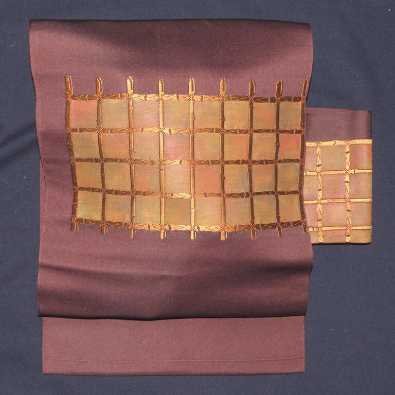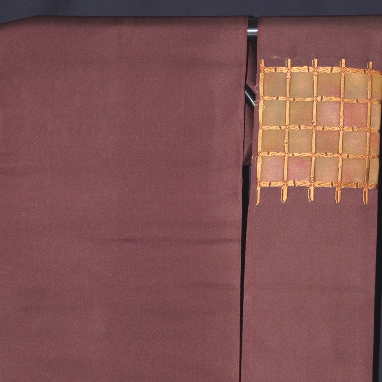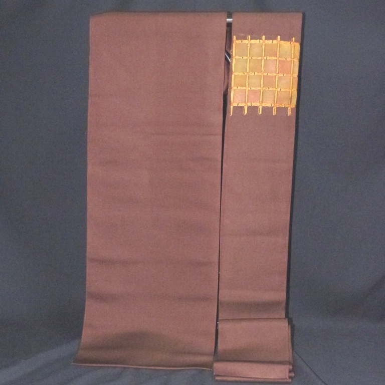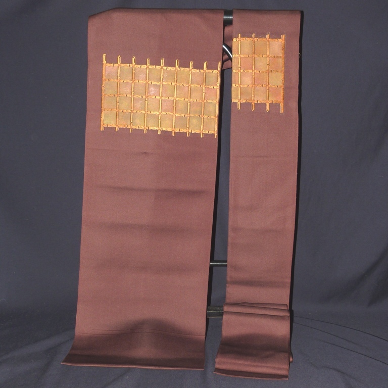 焦げ茶アート格子垣根柄 絹 長さ約3m48㎝激安