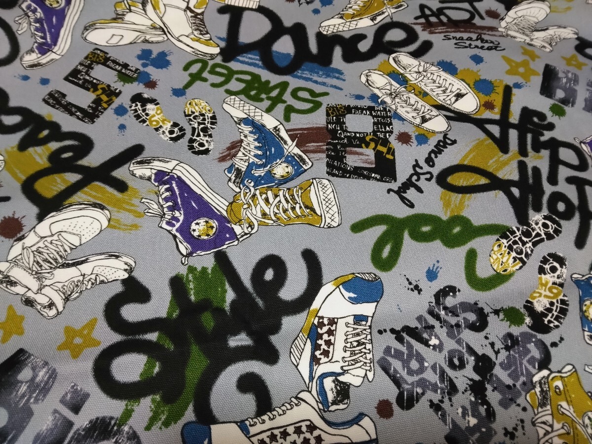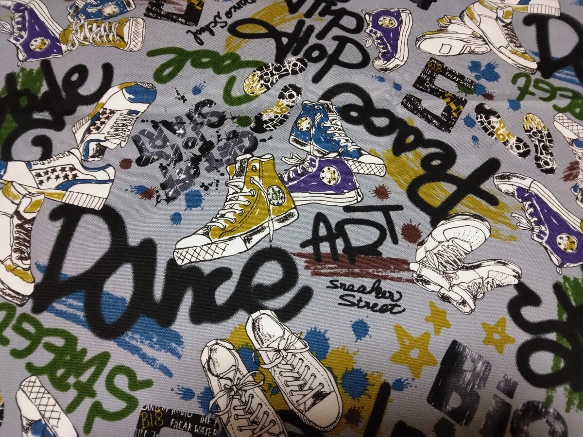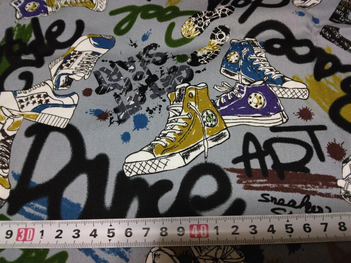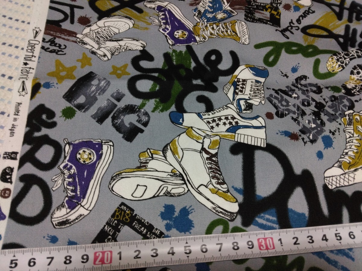 ストリート系のアートな文字やスニーカー柄のオックス生地です。110×50センチの金額になります。
