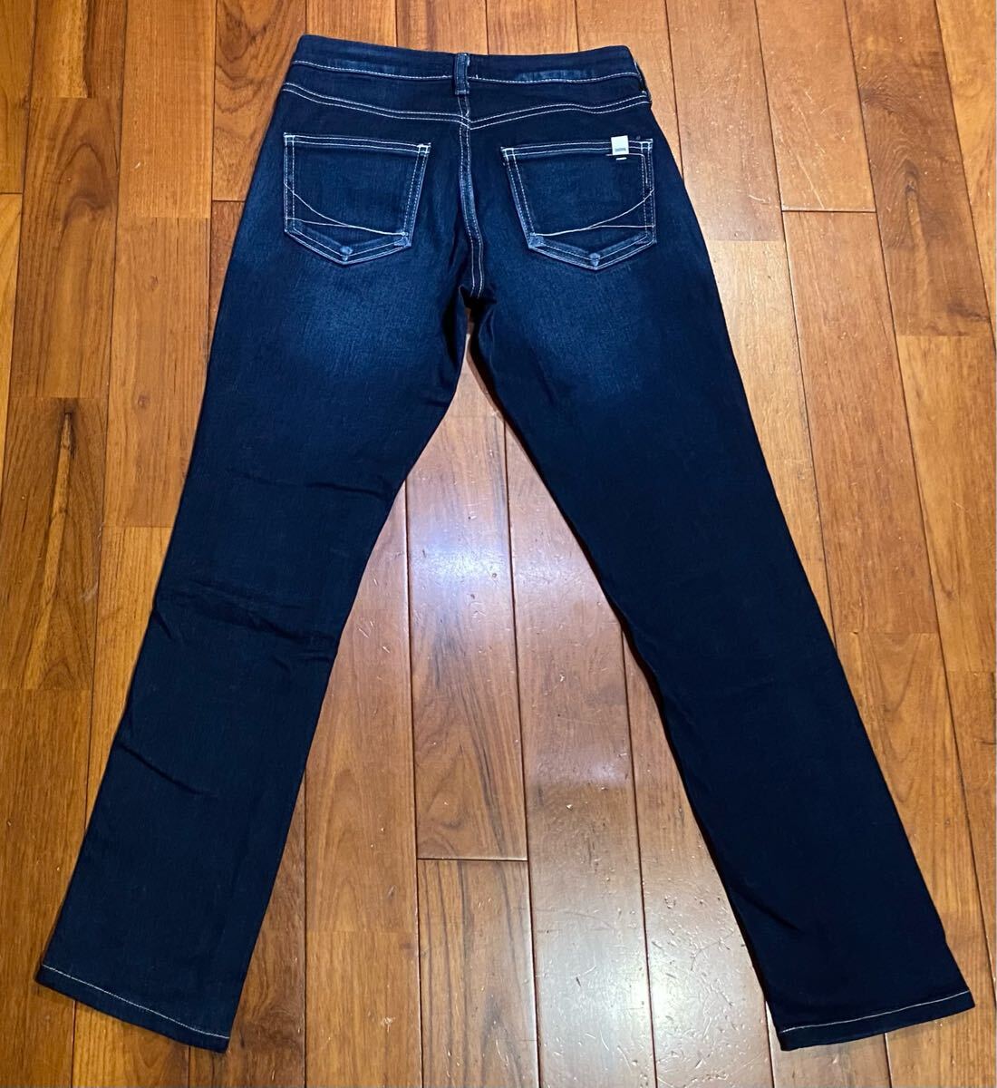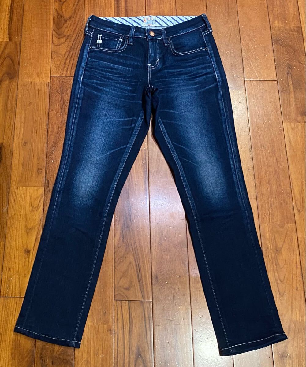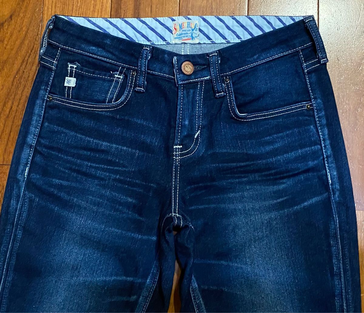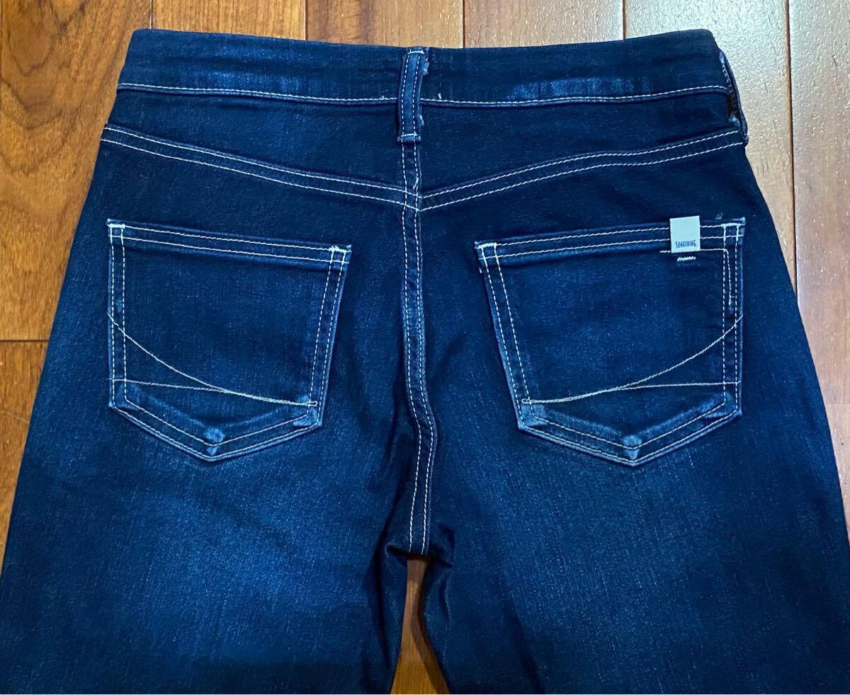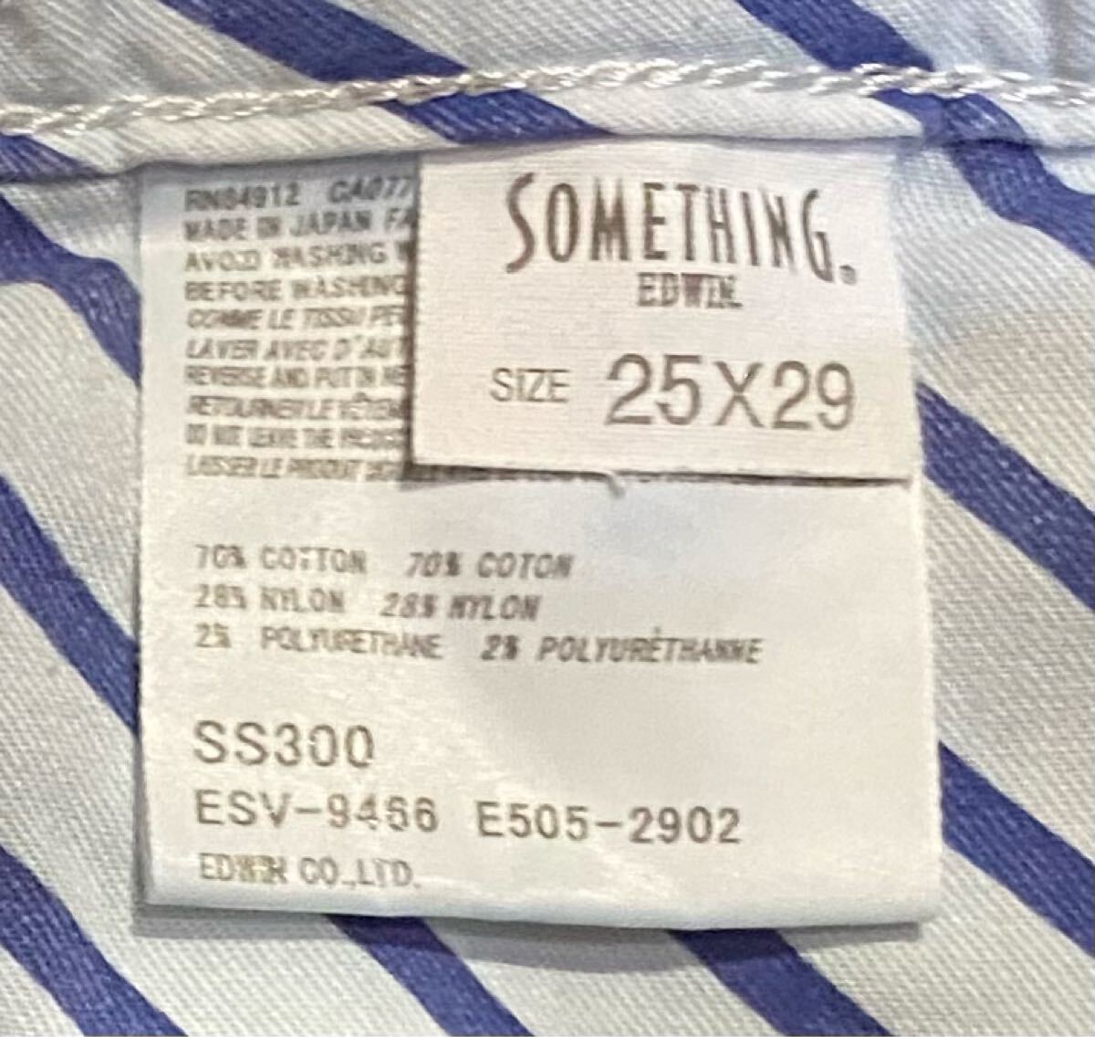 サムシングのストレッチデニムパンツ、SS300 ESV-9466 E505-2902です。色はインディゴブルーです。USEDで裾直ししておりますが状態は良いです(10段階中8程度)。布パッチ、ジッパーフライ、裾はチェーンステッチです。生地はストレッチ入りで綿70%、ナイロン28%、ポリウレタン2%です。正規品です((株)エドウィン、日本製)。サイズはW25でウエストは重ねずに平置きで約69cm、ヒップ約89cm、股上約20cm、股下約71cm、股下15cmのふともも部分約45cm、裾まわり約32cm、重量約370gです。発送はゆうパケットポストになります。