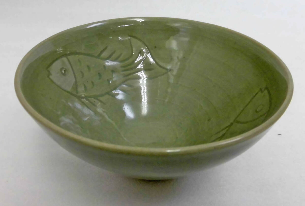 | 品名:青磁 双魚紋 茶 茶道具 作家:瓢箪に(竜?)の印 寸法:Φ≒13㎝丈≒7㎝ 状態:写真の通り内面に焼成による黒点一点があります。 きれいな貫入の表われている緑がかった青磁碗です。銘印の?は竜?かもです。 できるだけ説明いたしますが、写真でご判断ください。写真の色の誤差はご容赦ください 出品者の主観です:洒落た意匠で色目も寸法も優しく趣あるお品です。 | ||