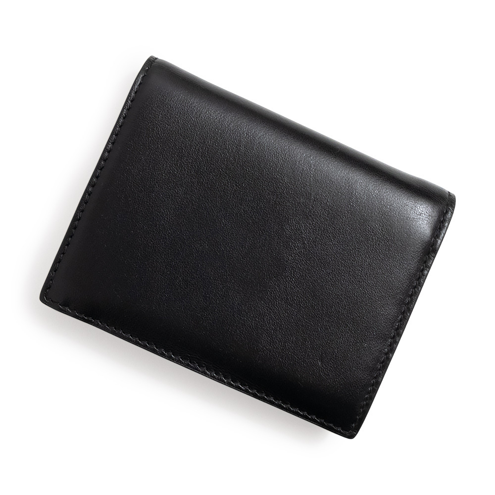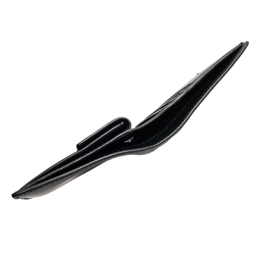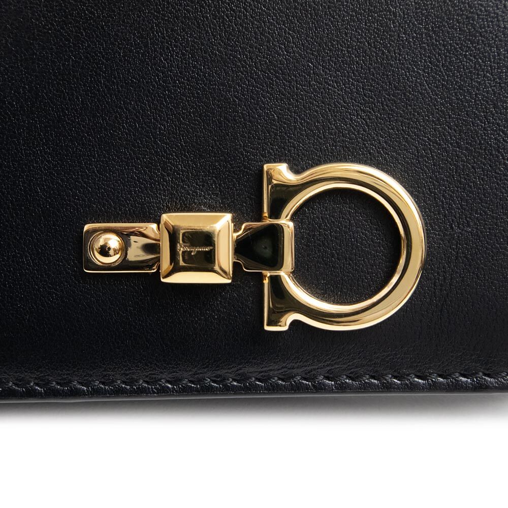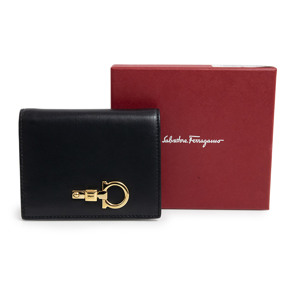 フェラガモのガンチーニ二つ折り財布。上品なブラックカラーのカーフスキンボディに、ゴールドのガンチーニ金具が施された上品なデザイン。伝統からくる信頼感がシックなイメージとともにエレガントな大人の印象を与えます。