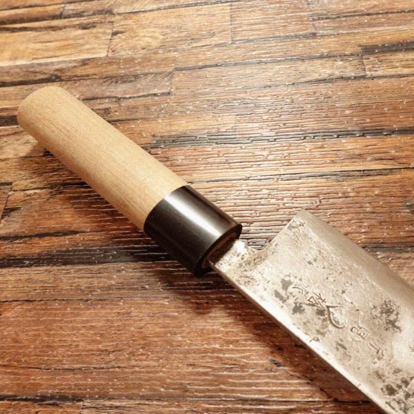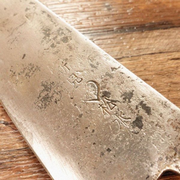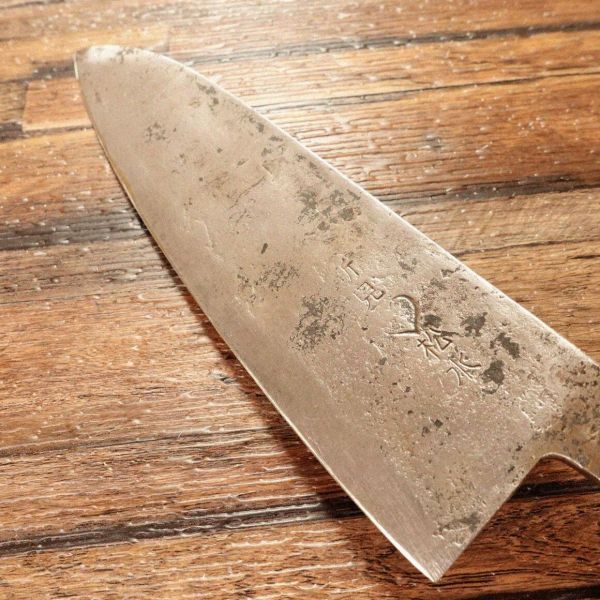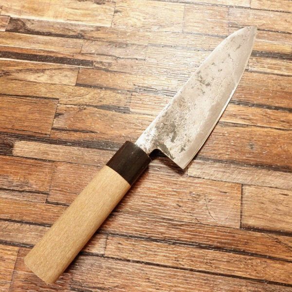 三徳包丁は肉、魚、野菜を問わず、さまざまな調理に対応できる万能包丁です。黒打ちの部分が薄くなっておりますが、人気の新見松水のブランド包丁です。柄は取り替えられたのか、新品状態、非常にきれいです。