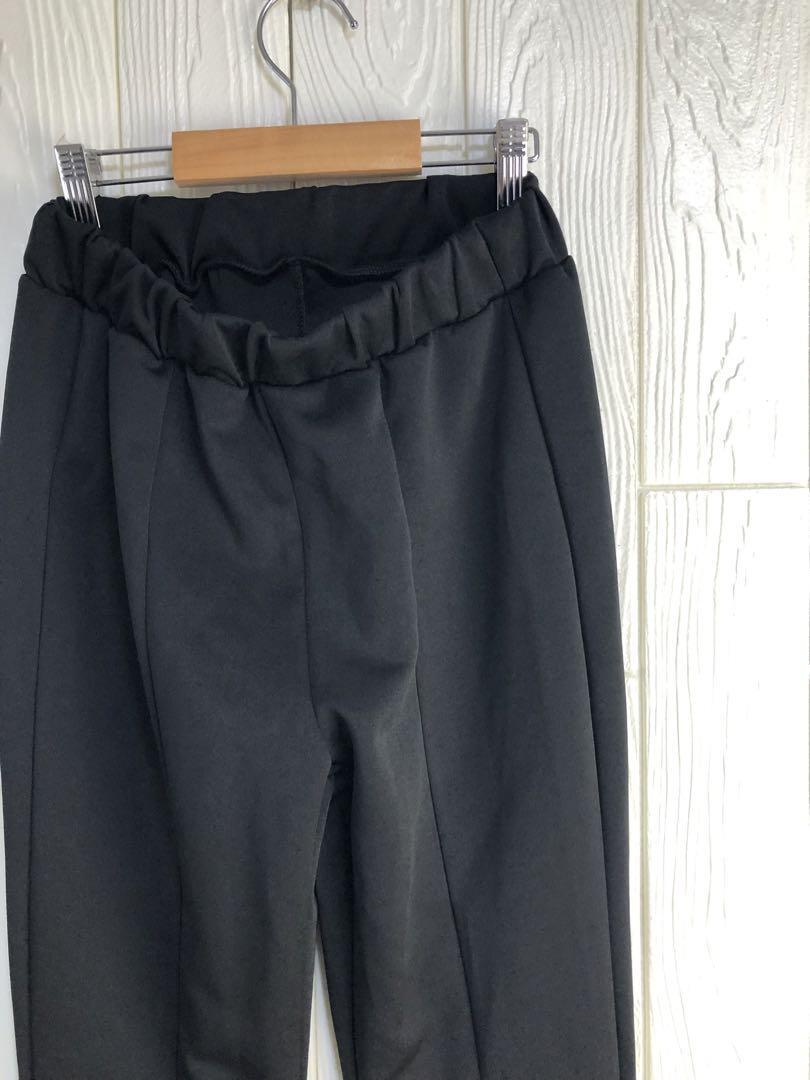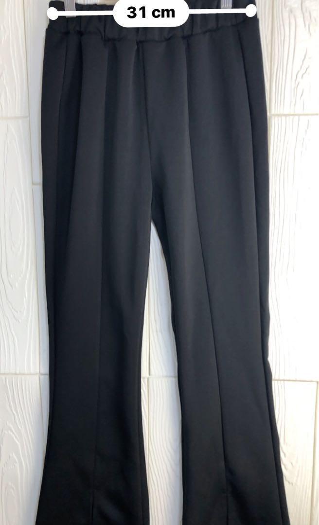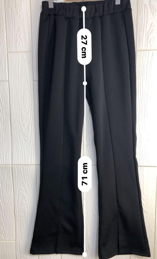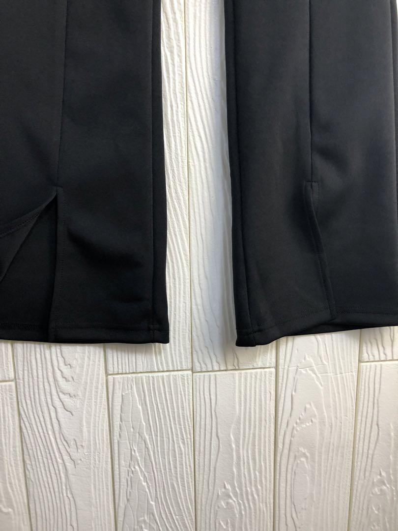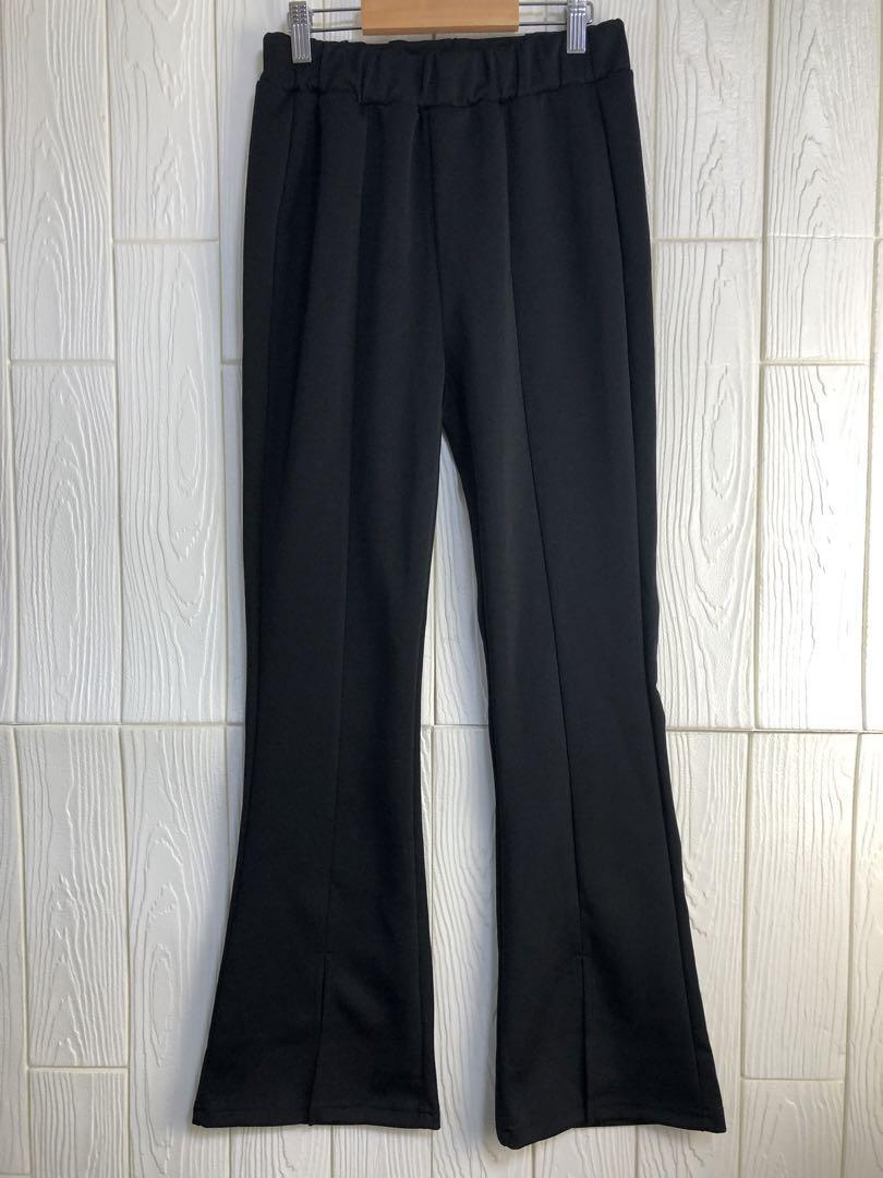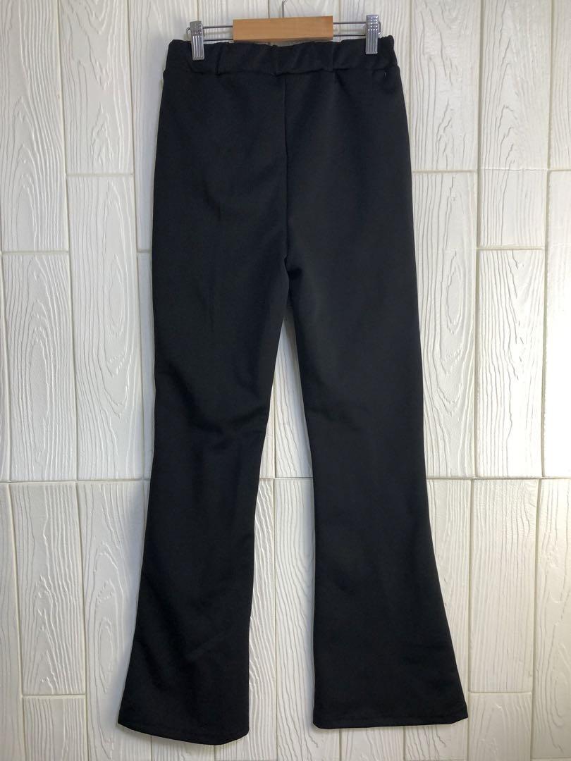 シンプルなブラックパンツ、フレアデザインでスタイリッシュ。