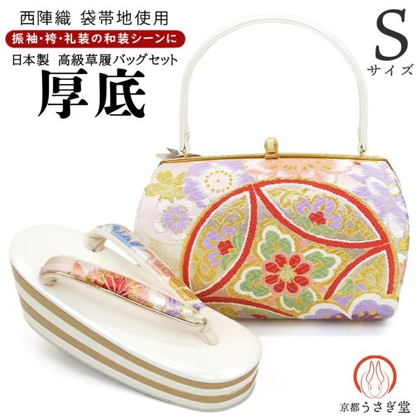 上品な藤色で鮮やかなお柄が織り込まれた西陣織帯地の草履バッグセットです。