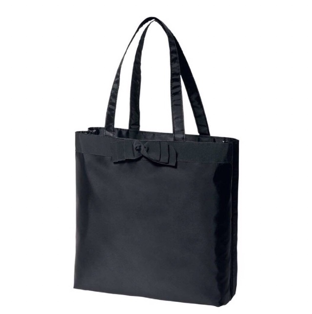 シンプルなオールブラックの縦長トートにランバン ノワールらしいアシンメトリーなグログランリボンをONしてモードな印象に仕上げました。